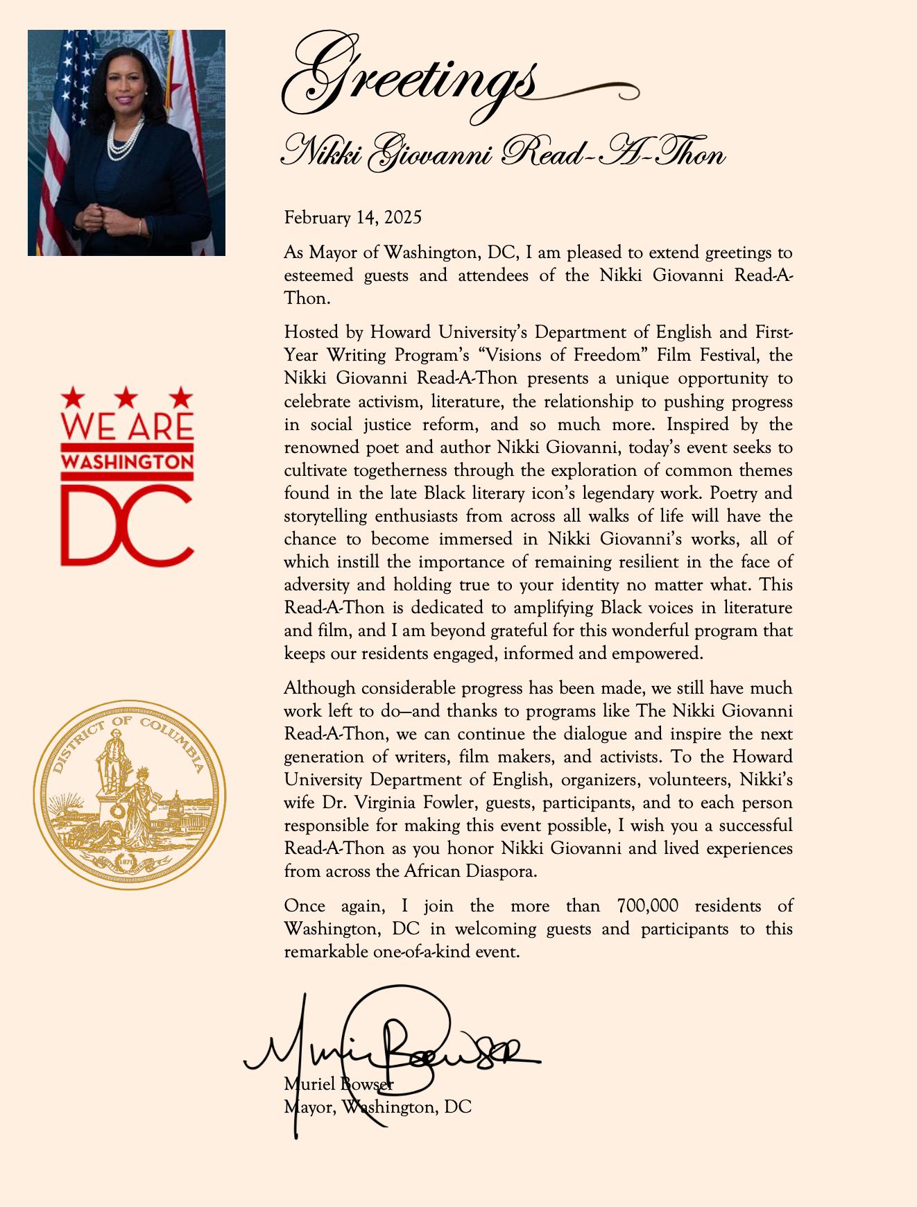 Special Zoom Link (Nikki Giovanni Read-A-Thon – Day 4, 12–2 PM): https://howard.zoom.us/j/88283060955?pwd=aGab9yMGPgUPhKCrQBm5gGGzC9VjOg.1