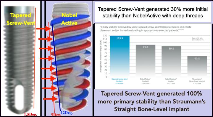 This is in contrast to most other implant companies insertion protocol for a tapered implant. They follow a soft-bone/hard bone surgical concept first published by Niznick 2000, that varies the diameter of the final drill based on the density of the bone. To achieve insertion in dense bone without use of a bone tap by preparing a socket almost as wide as the diameter of the implant. That way, only the tips of the threads engage dense bone and full seating can be achieved. In soft bone the final drill undersizes the socket so that insertion compresses the bone and increases its density and the stability of the implant.