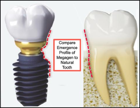 Megagen’s AnyRidge implants are available in diameters ranging from 3.5mmD to 8mmD as measured to the outside diameter of the threads. The neck and core diameters remain the same for implants 3.5mmD through 5.5mmD but increase in size with the 6.0mmD to 8.0mmD implants. All Megagen AnyRidge implants have the same implant/abutment interface. Using a single platform over this wide a range of implant diameters compromises the emergence profile and provide questionable strength with the use of the same small neck diameter of abutment is used on the 3.5mmD implant in the esthetic zone as the 8mmD implant recommended for molar restorations. As can be seen below (L), use of a single abutment platform is not conducive for a natural emergence profile and the abutments for cementable restoration do not have a contoured margin. If recession takes place and the margin of the pre-parable abutment needs to be lowered, the steep undercut below the abutment’s height of contour will not allow such adjustments.
