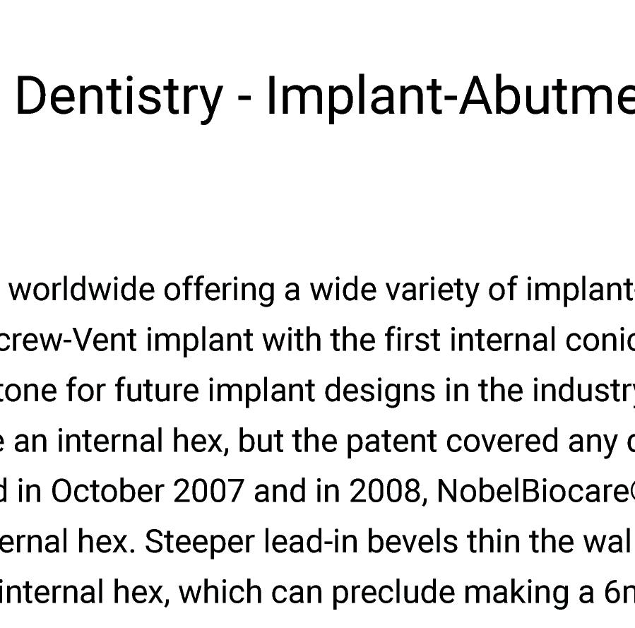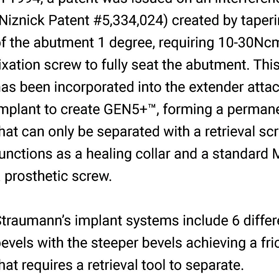Industry Standard 45° lead-in Conical Connection (Niznick US Patent #4,960,381) maximizes wall thickness on narrow implants