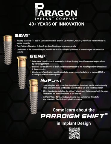 NizPlant™ has a 45° lead-in bevel, internal hex, and internal threads for attachment of a fixed full-arch hybrid restoration