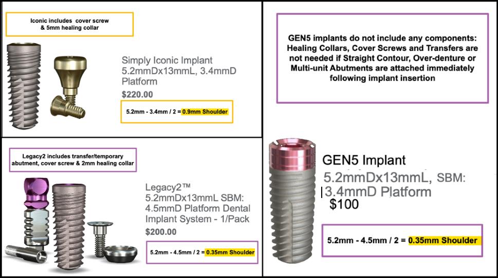 FACT: The diameter of a crown on a tooth flares out from the CEJ in what is a smooth emergence profile. If teeth drift to reduce the width of the space, the diameter of the implant, the abutment and the crown will also have to be reduced in diameter. There is no reason not to maintain a smooth emergence profile for both esthetic and hygienic reasons. The Iconic implants from 3.2mm to 4.7mm all have the same 3.0mmD platform. The 4.7mmD implant also has an option of a 3.4mmD platform in an effort to improve the emergence profile, but the difference is only 0.2mm on each side, about twice the thickness of a human hair. The greater problem exists with the 4.7mmD, 5.2mmD and 5.7mmD Iconic implants with its 3.4mmD platform, compared to Legacy for the same diameter implants of 4.5mmD and 5.7mmD platforms.