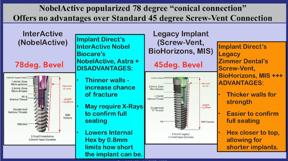 Fact: The internal hex connection of the Legacy implants is the original conical connection. Both the Legacy and Iconic implants have internal hexes. The differences are in the angle (45deg. Vs 78deg.) and depth (0.5mm vs 2mm) of the lead-in bevels and the diameter of the internal shaft that receives the abutment. Implant Direct does offer a variety of implant systems with various surfaces (HA and SBM), tissue and bone level (SwishPlant, GoDirect and ScrewIndirect tissue level implants). As the developer of both the Legacy and InterActive implant systems, I would never have considered using the connection of one with the body dimensions of the other. The only purpose in the first place for developing the InterActive was to offer a low priced alternative to NobelActive customers. Implant Direct is now operated as a division of NobelBiocare. The only business rational I can figure for Implant Direct’s promotion of the Iconic implant over its flagship Legacy product line is that NobelBiocare wants Implant Direct to also be advocating its 78 degree conical connection as the “industry standard.” Of course, the introduction and promotion of the Iconic allows Implant Direct to charge an additional $50 for every Legacy1 implant and $20 for every Legacy2 implant sale it converts to the Iconic at $220.
