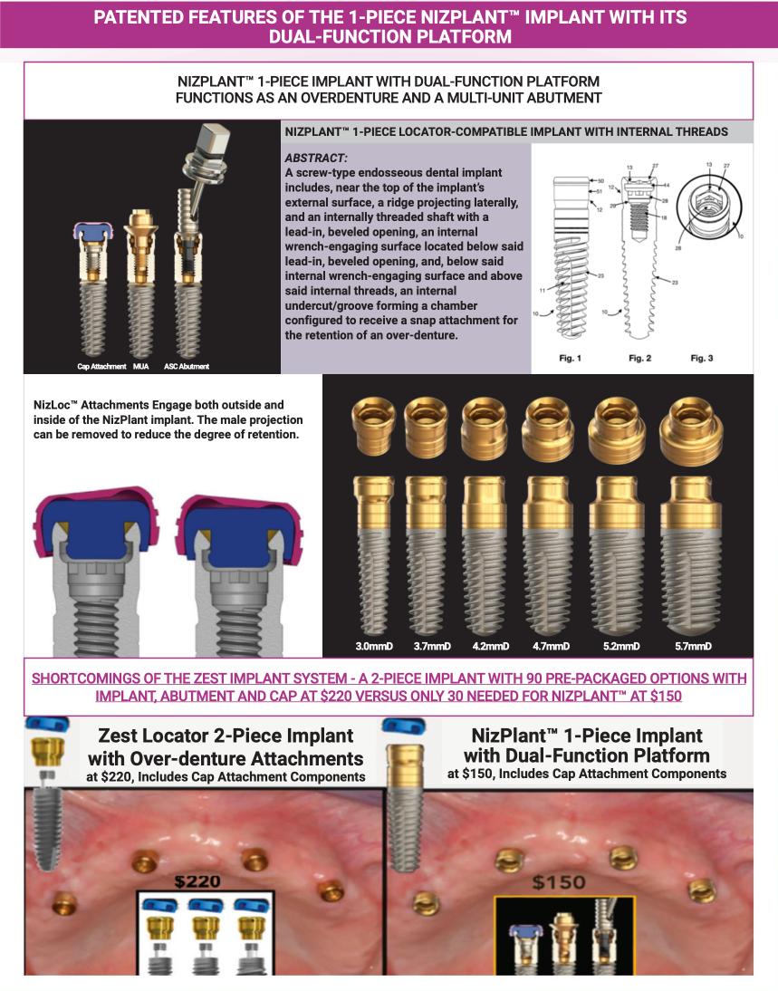 Gerald Niznick DMD, MSD, a prosthodontist, started his career as an implant manufacturer in 1982 with the launch of Core-Vent Implant System. In 1986, Core-Vent introduced the Screw-Vent implant with an internal hex and 45deg. lead-in bevel, the first conical connection (Niznick U.S. Pat. #4,960,381). In 1999, Dr. Niznick’s company, then called Paragon, launched the Tapered Screw-Vent (TSV) with the same conical connection. This implant became the cornerstone for most modern day implant designs. In 2001, Dr. Niznick sold his company and patents to what became Zimmer Dental and eventually ZimVie. Through 2022, the TSV was ZimVie’s flagship product. In 2004 Dr. Niznick formed Implant Direct (“ID”) and in 2007, shortly following the expiration of the conical connection patent in October 2007, ID launched the Legacy implant with the TSV’s 45deg. lead-in bevel and NobelBiocare introduced the NobelActive with its 78deg. conical connection. The 45deg. lead-in bevel internal hex connection has been copied by so many companies that it is often called the “Standard” connection. The first version of the Legacy implant differed from the TSV in that it included microthreads on the neck (Niznick U.S. Patent #7,677,891). Legacy 2, 3 and 4 were added with progressively deeper threads and with different packaging options. The Legacy 4 is supplied on a carrier that also serves as a transfer and straight abutment (Niznick Pat. 9,697, 748) To offer a cost effective, prosthetically compatible alternative to the NobelActive, Dr. Niznick developed the InterActive with a NobelActive compatible 78deg. conical connection and launched it in 2013. The InterActive has the body of the Legacy 2 & 4 implants with micro-grooves added above the microthreads (Niznick U.S. Patent #7,677,891). Dr. Niznick sold 75% of Implant Direct to Sybron, a division of Danaher, at the end of 2010 and remained president through 2013 when Sybron bought his remaining 25%. Danaher acquired NobelBiocare the end of 2014. Danaher spun off all its dental divisions around 2020 under the name Envista, and today, Implant Direct is operated as a division of NobelBiocare, sharing management, shipping facilities, sales meetings and symposiums. A decade after Dr. Niznick retired as president, Implant Direct launched what it calls the “Iconic”TM Implant with the NobelActive 78 degree lead-in bevel, claiming that connection is now the “industry standard.” Rather than “Iconic," this implant could be called the “Ironic” implant. The mismatch between the Legacy implant diameters ranging from 3.2mmD to 5.7mmD and NobelActive 3.0mmD and 3.4mmD conical connections creates limitations in strength with its smaller diameter implants and compromises in emergence profile with its larger diameter implants. Implant Direct’s US list price for the Iconic implant is $220 including a cover-screw and healing collar in contrast to the NobelActive at $538 plus $66 for Cover Screw and $76 for a Healing Collar ($538 + $66 +$76 = $680 — $220 = $460, a 68% savings). NobelBiocare customers should ask the question posted on Implant Direct's Website: “WHY ARE YOU STILL OVERPAYING FOR IMPLANTS?”