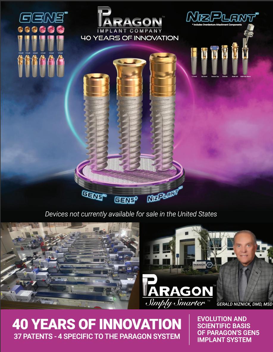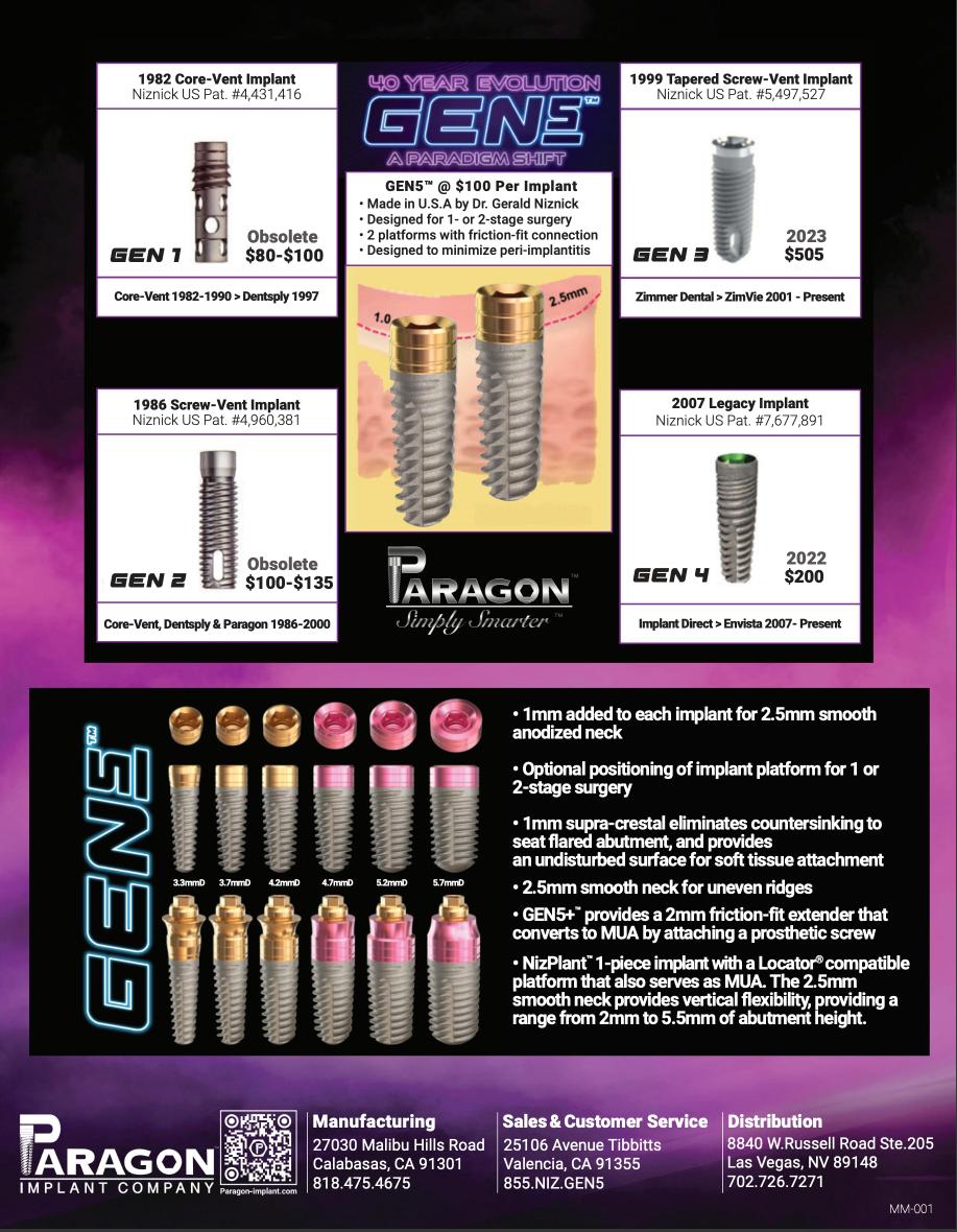 To validate its Iconic System, Implant Direct claims “we’re experts in all things implantology. Almost 20 years ago we set a new standard for quality care with clinically proven implant systems made right here in the U. S.” While this may be true, it has nothing to do with the current product development and engineering team at Implant Direct today. All the “clinically proven implant systems” sold by Implant Direct prior to 2023 were developed by Dr. Gerald Niznick and were covered by 10 patents issued to him, as shown below. Even Implant Direct’s Toll Free phone number 888.649.6425 spells out Dr. Niznick’s name. Dr. Niznick started Paragon Implant Co. April 2022 in his Calabasas factory that he rented to Zimmer Dental from 2001-2004 and to Implant Direct from 2004-2014. Since Paragon Implant Company about 28 employees left Implant Direct to join Paragon, confident that Dr. Niznick’s ability to innovate new products and his commitment to both quality and value, assured the success of his new company.