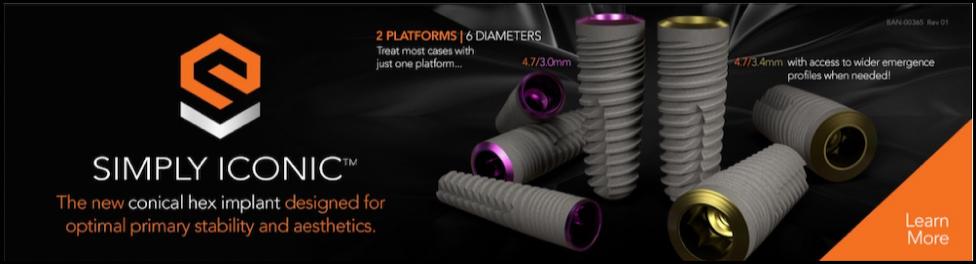 “This means that restorative components can be an industry standard 3.4-mm conical connection, allowing for the ideal implant emergence profile and esthetics, even for wider body 4.7-or 5.7-mm diameter implants. “This makes Simply Iconic perfect for immediate implant placement,” he added.”