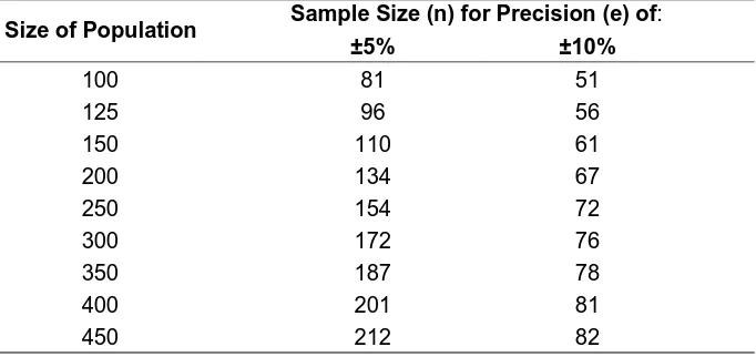 Table 2 Sample Size for ±5% and ±10% Precision Levels where Confidence Level is 95% and P(population proportion)=0.5 when population size is less than equal to 500