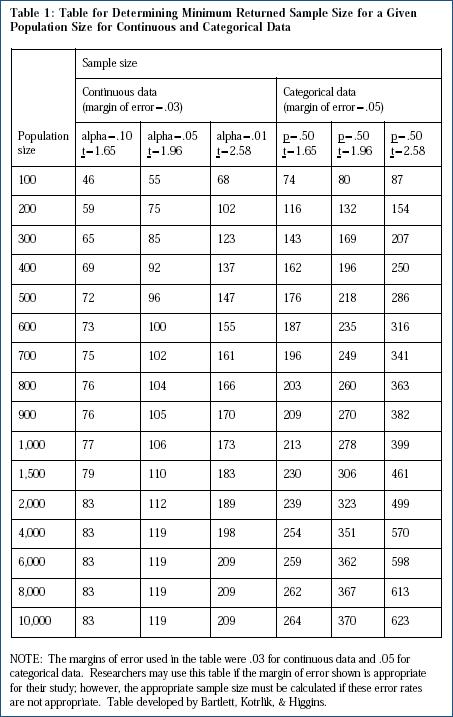 n is the required sample size, P is the percentage occurrence of a state or condition, E is the percentage maximum error required, Z is the value corresponding to level of confidence required. There are two key factors to this formula (Bartlett et al., 2001).
