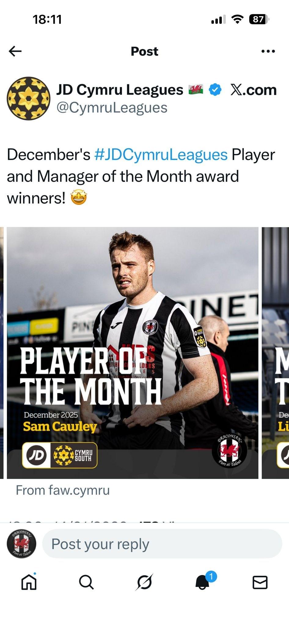 OW: I was very happy to score against Cwmbran Celtic as it earned us all 3 points. A proud moment for me personally and I hope to chip in a few more times in the season to help the team progress up the table.