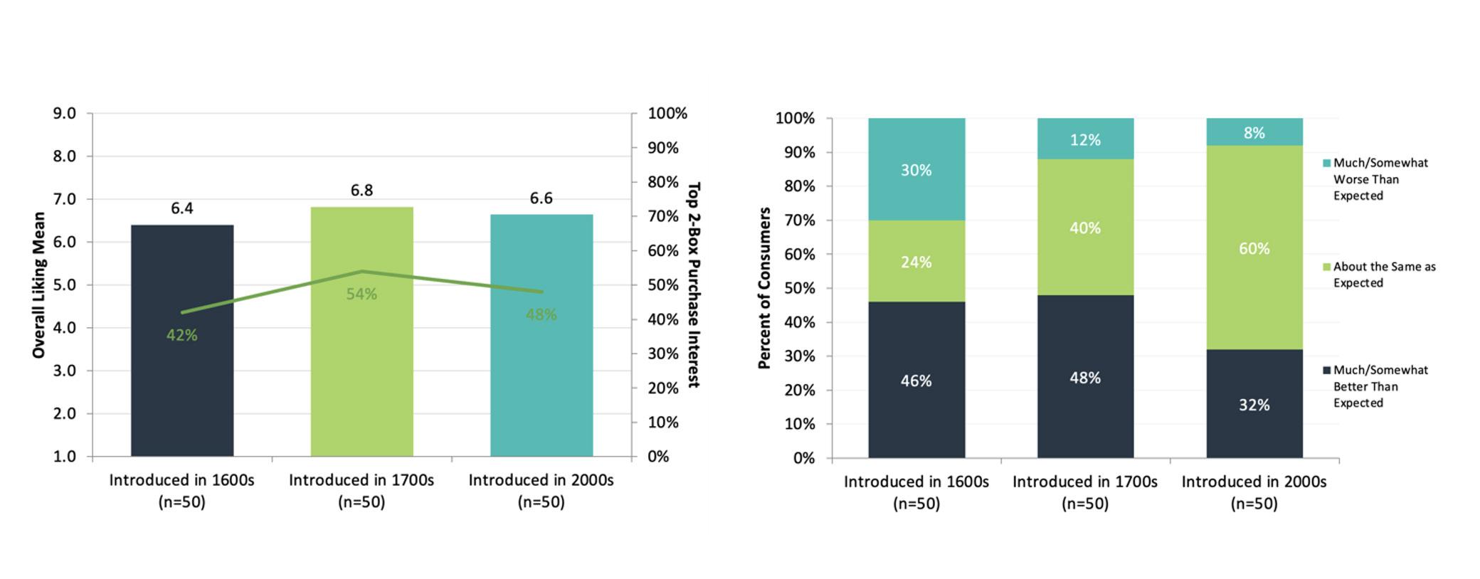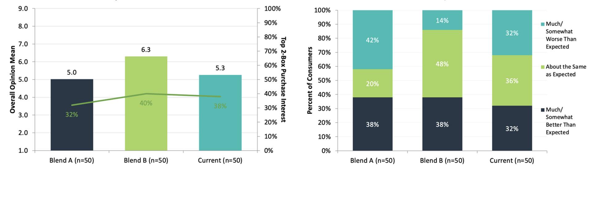Blend B exceeded the action standard with an average liking score 1.0 point higher than the current blend. Blend B also had the fewest “worse than expected” responses.
