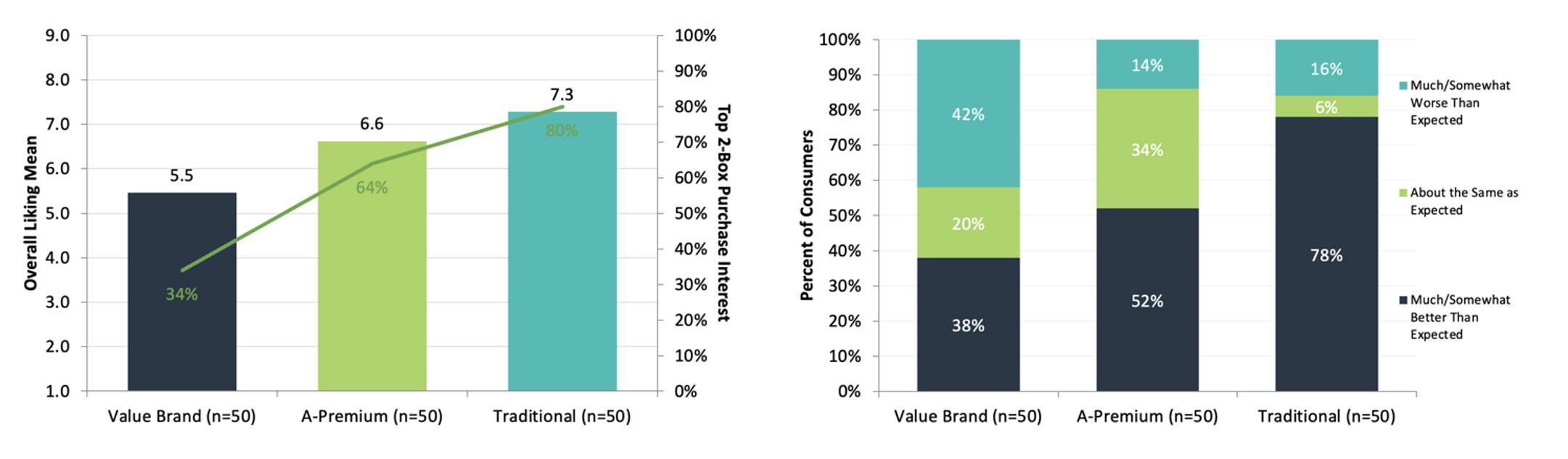 Specialty is rated higher for overall liking and purchase interest and meets expectations better than Supermarket and Natural.