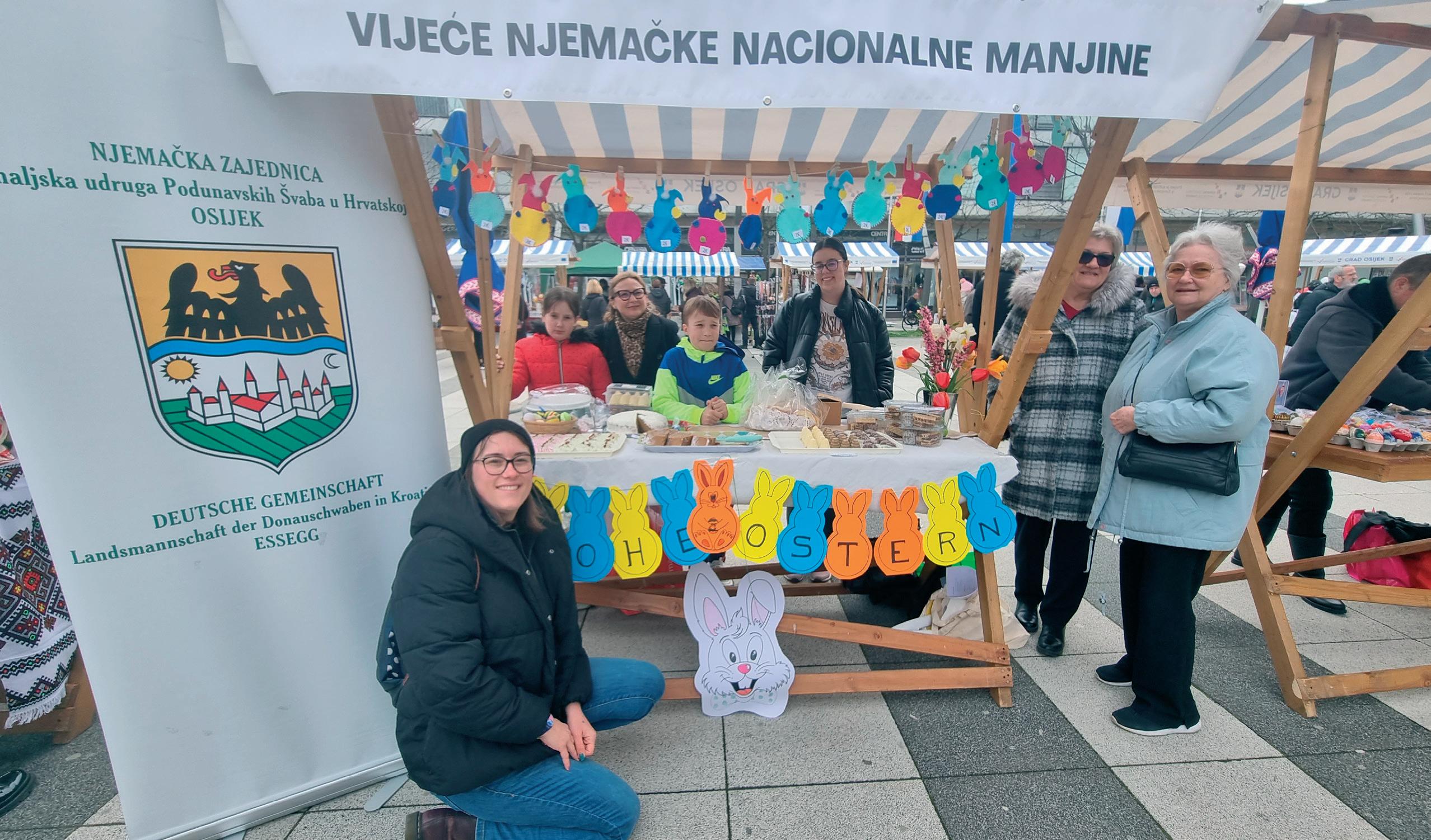 Wie schon seit Jahren nahm die Deutsche Gemeinschaftam am Vorabend von Ostern (8. April am Trg Slobode in Osijek) an der Veranstaltung “Bunte Eier in Farben der Stadt” teil. Die Mitglieder der Gemeinschaft gaben sich die Mühe, eine Reihe kulinarischer Köstlichkeiten zum Thema Ostern für die Besucher der Veranstaltung vorzubereiten. Nicht nur die Bürger von Osijek, sondern auch unsere zeitweilige Teilnehmer der Samstasschule, sowie unsere, jetzt schon erwachesene, ehemalige Teilnehmer besuchten unseren Stand.