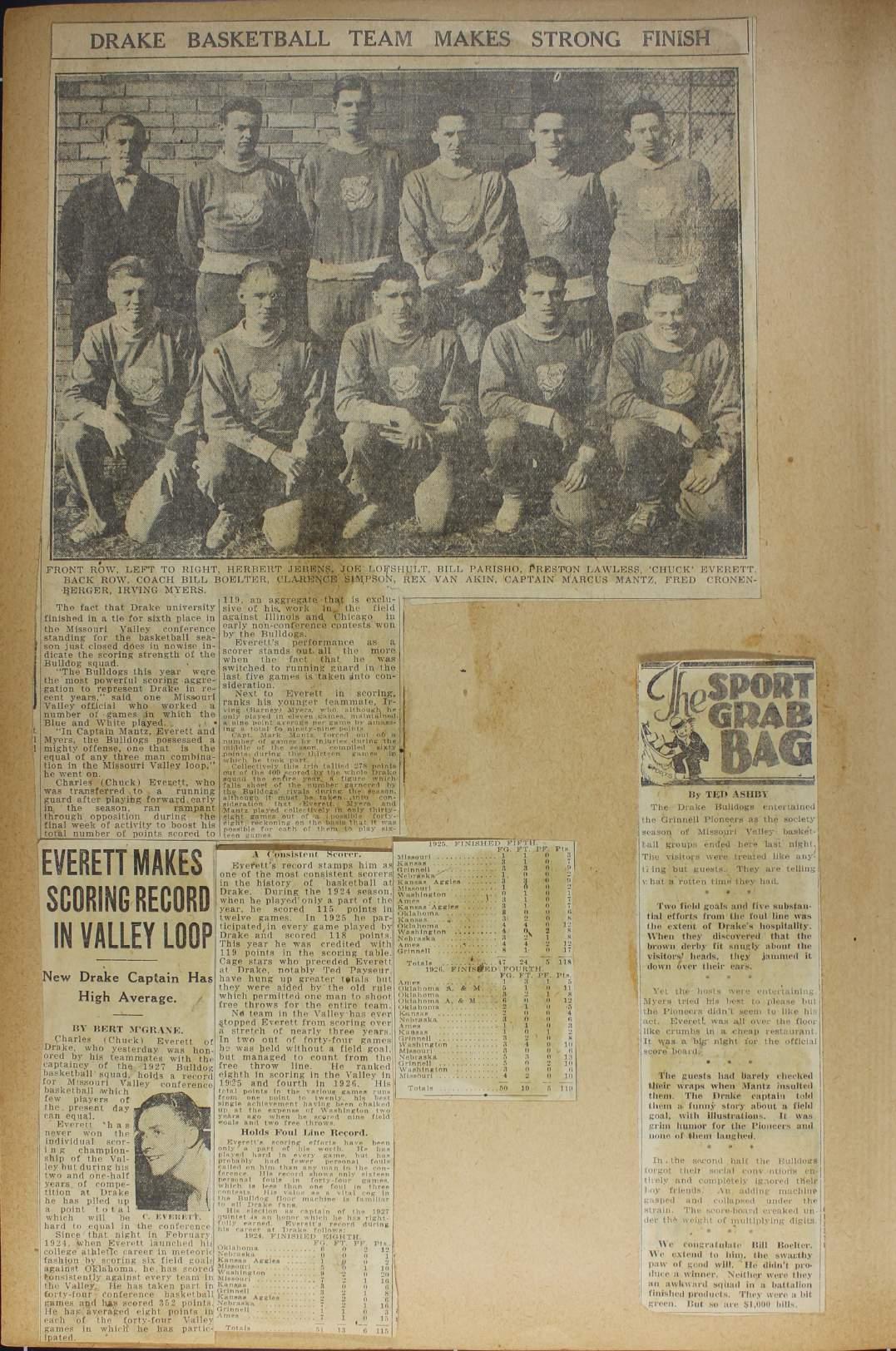 This scrapbook, which dates from 1920 to 1966, includes newspaper clippings, photographs, and ephemera related to the playing and coaching career of William "Bill" Boelter at Drake University. Learn more about "Bill" Boelter by visiting the Drake University Archives finding aid for this collection: http://tiny.cc/qk62vz.