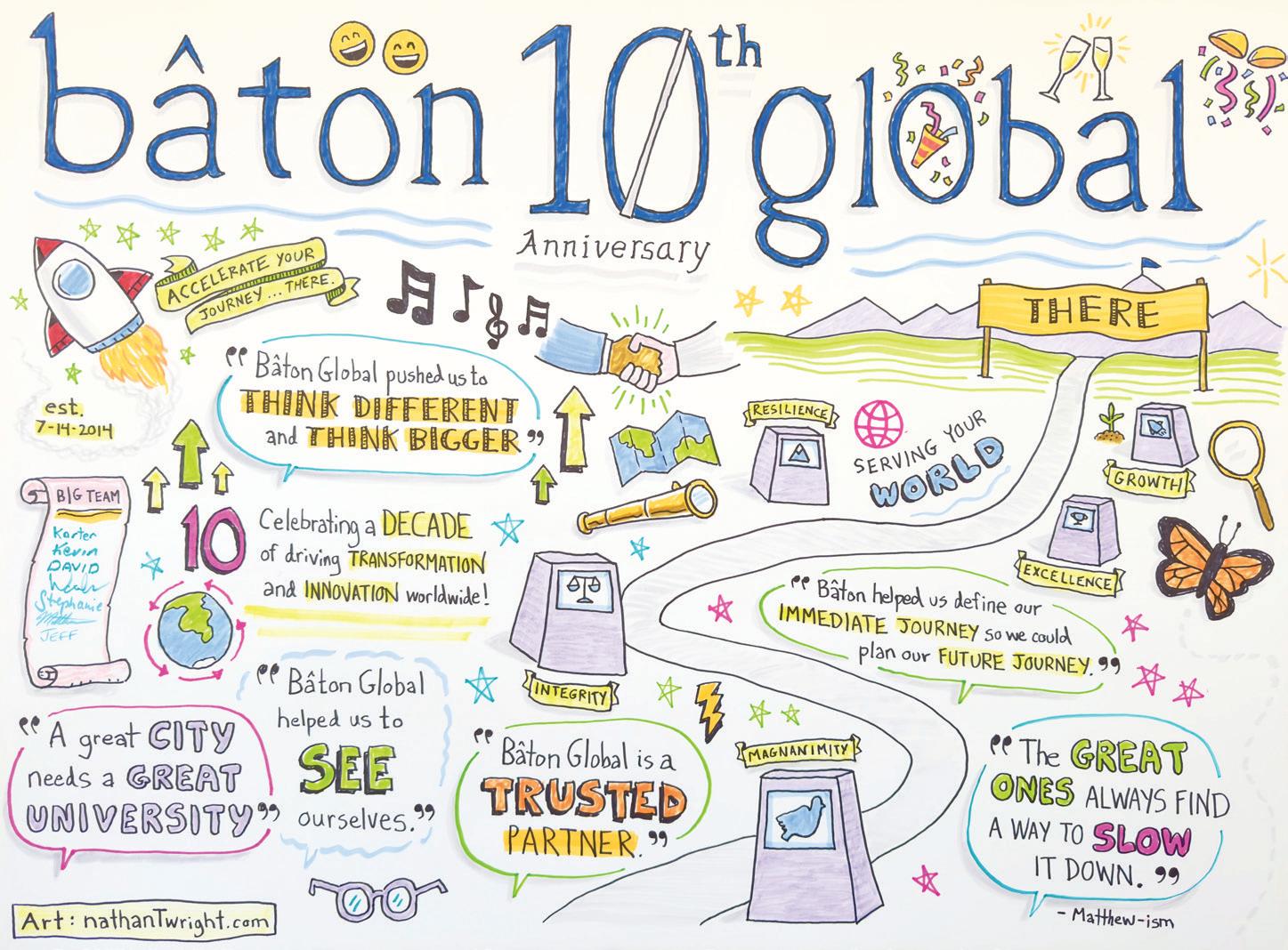 and collaborators. Local artist Nathan Wright captured the decade’s highlights in a graphical recording, showcasing the impact of Bâton Global’s work through the voices of its partners.