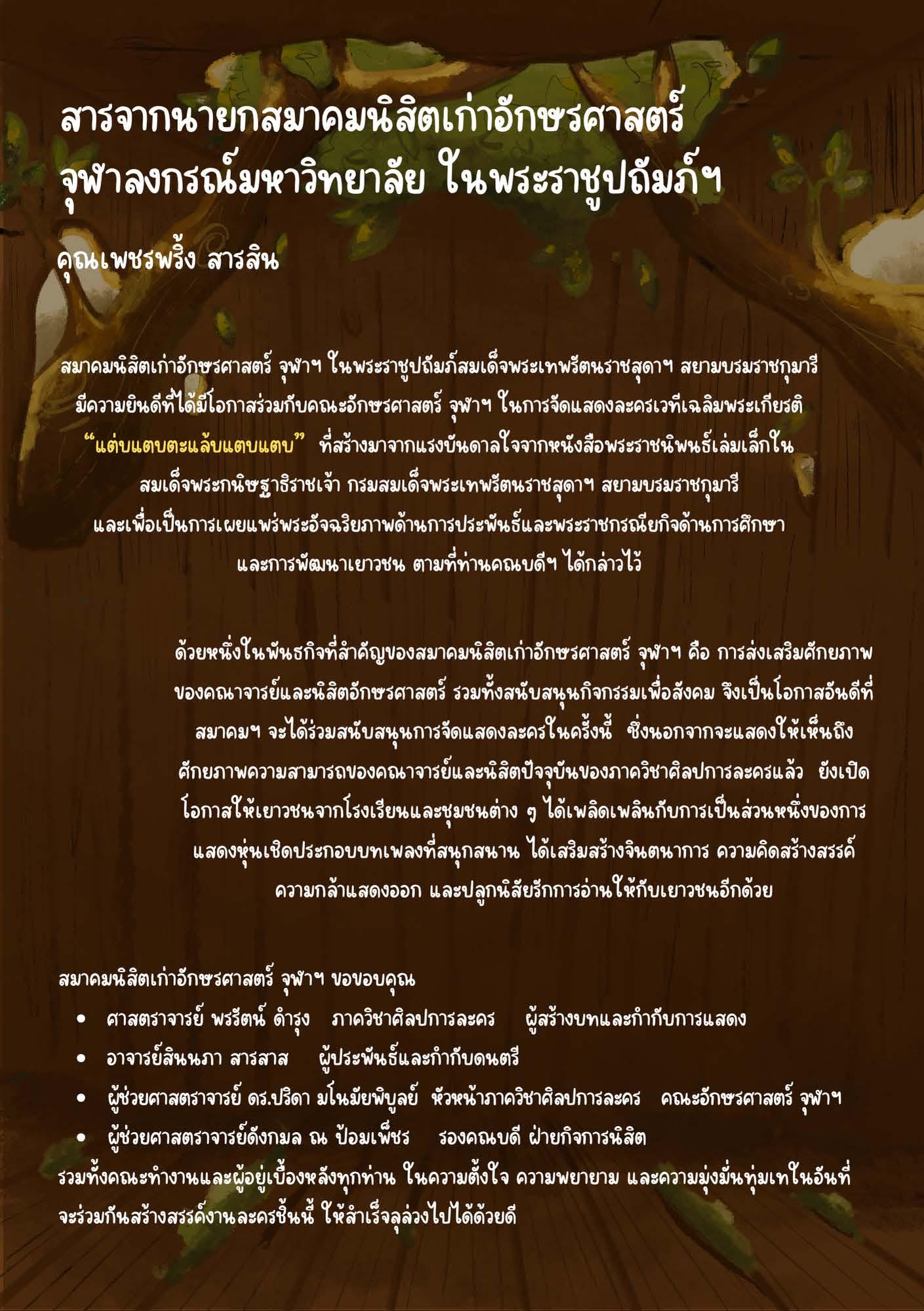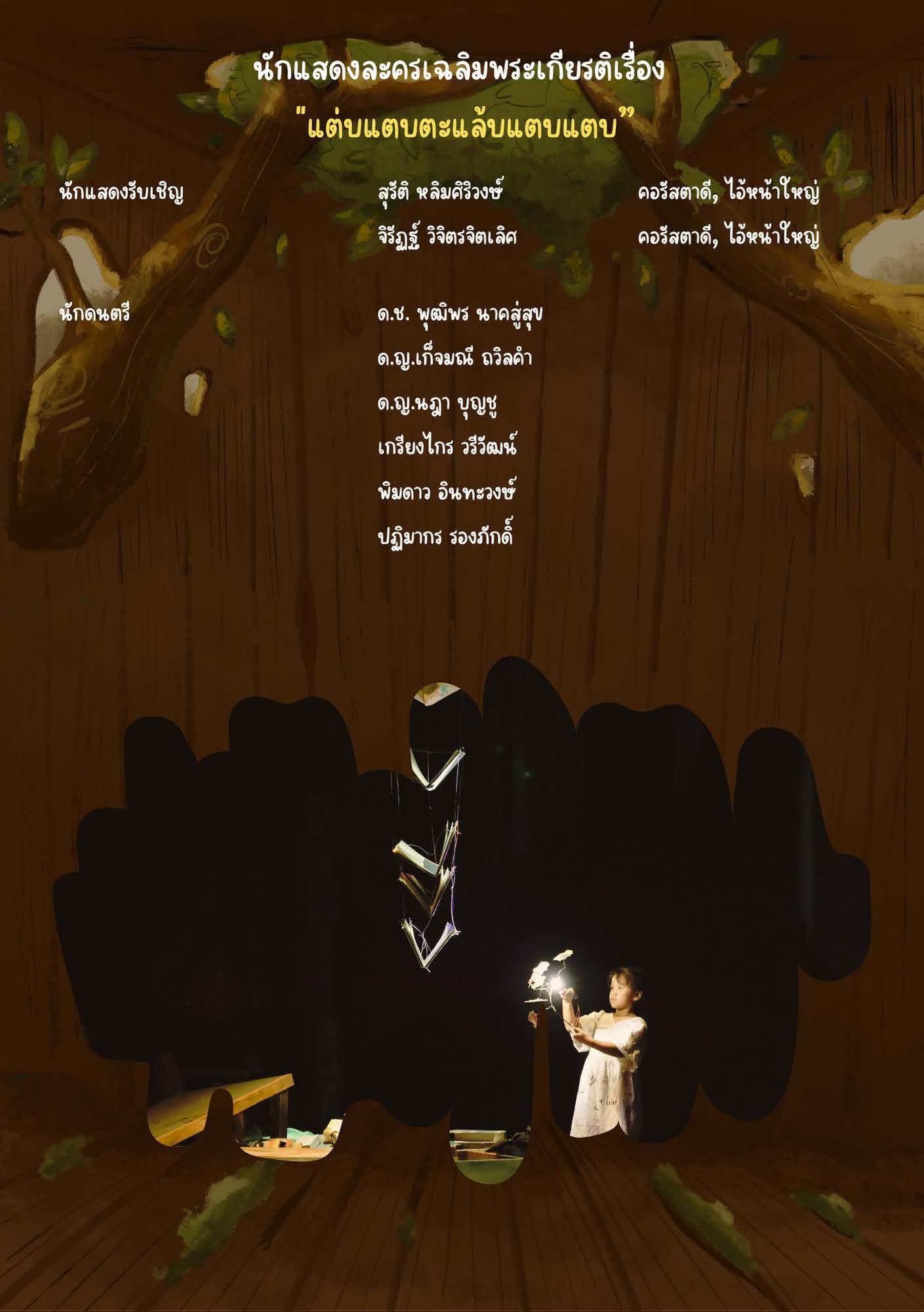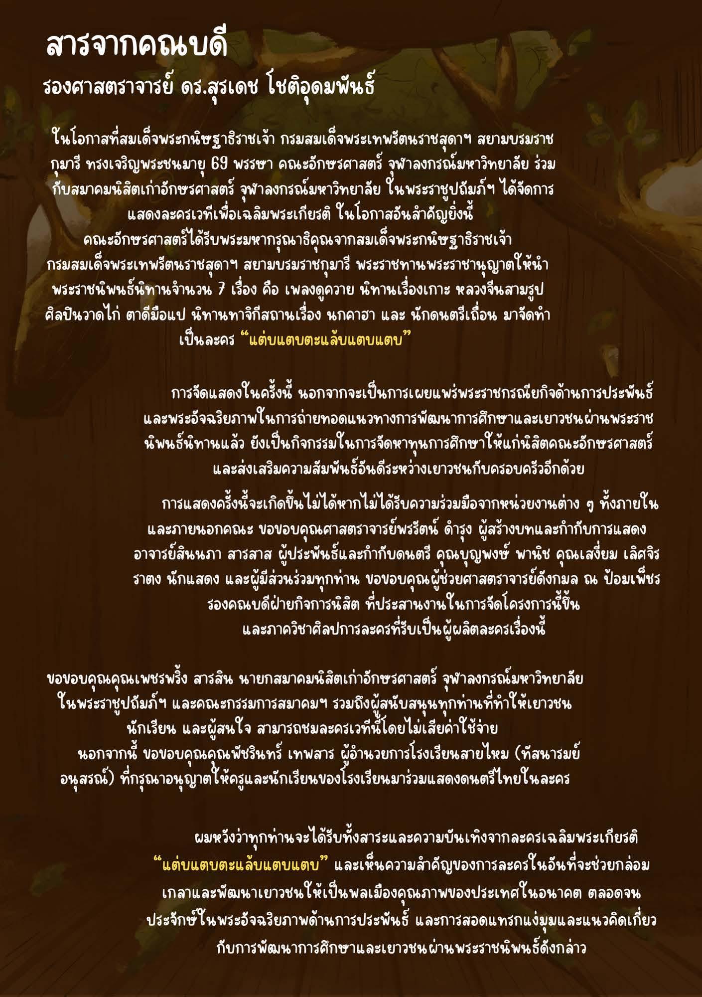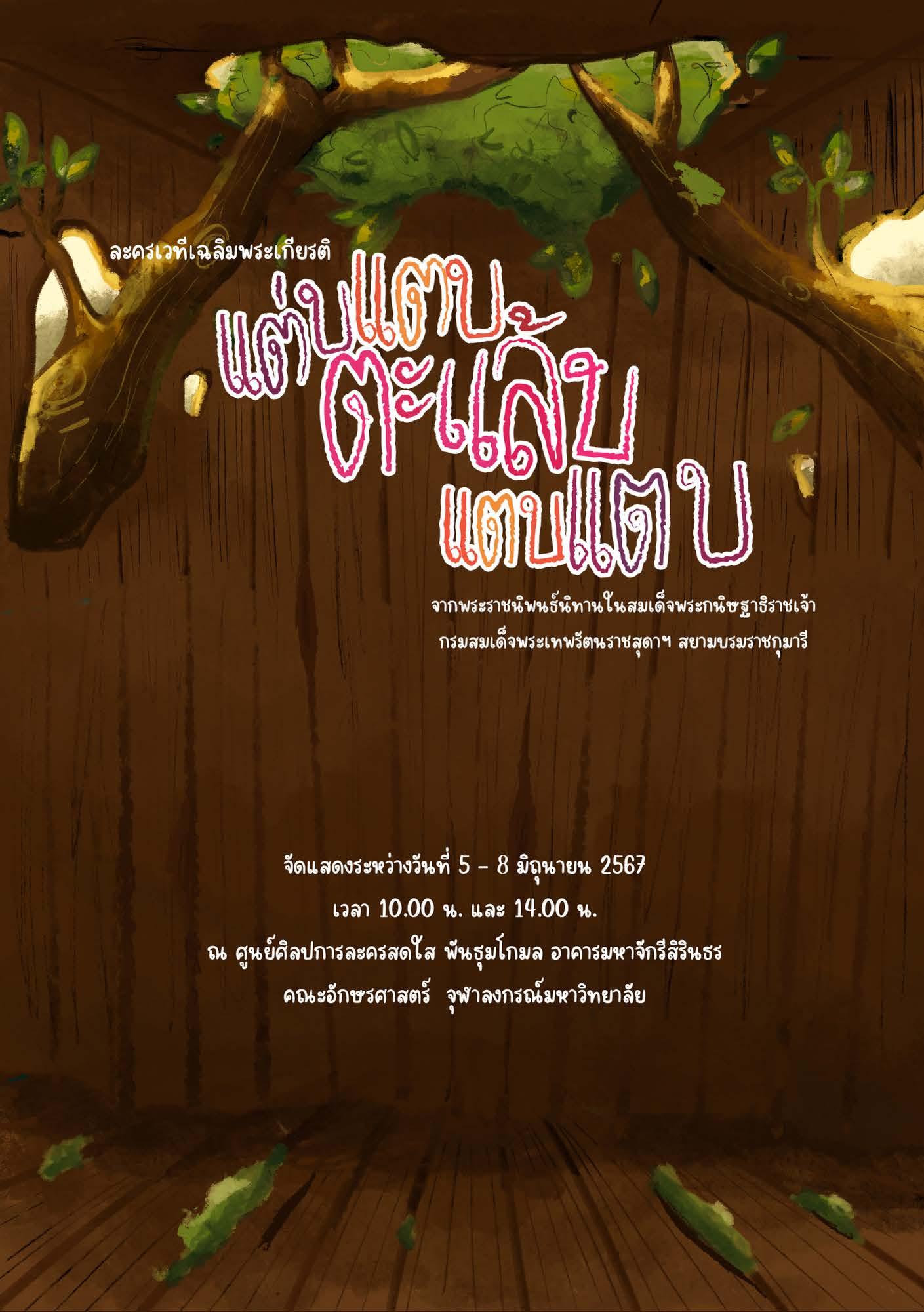 ในโอกาสที่สมเด็จพระกนิษฐาธิราชเจ้า กรมสมเด็จพระเทพรัตนราชสุดา ฯ สยามบรมราชกุมารี ทรงเจริญพระชนมายุ 69 พรรษาในวันที่ 2 เมษายน 2567 นี้ คณะอักษรศาสตร์ จุฬาลงกรณ์มหาวิทยาลัย ร่วมกับสมาคมนิสิตเก่าอักษรศาสตร์ จุฬาลงกรณ์มหาวิทยาลัย ในพระราชูปถัมภ์ฯ จะจัดการแสดงละครเวทีเฉลิมพระเกียรติเรื่อง “แต่บแตบตะแล้บแตบแตบ” จากพระราชนิพนธ์นิทาน ระหว่างวันที่ 5 - 8 มิถุนายน 2567 ณ ศูนย์ศิลปการละครสดใส พันธุมโกมล ชั้น 6 อาคารมหาจักรีสิรินธร คณะอักษรศาสตร์ จุฬาลงกรณ์-มหาวิทยาลัย โดยมีศาสตราจารย์พรรัตน์ ดำรุง เป็นผู้สร้างบทและกำกับการแสดง และอาจารย์สินนภา สารสาส เป็นผู้ประพันธ์และกำกับดนตรี