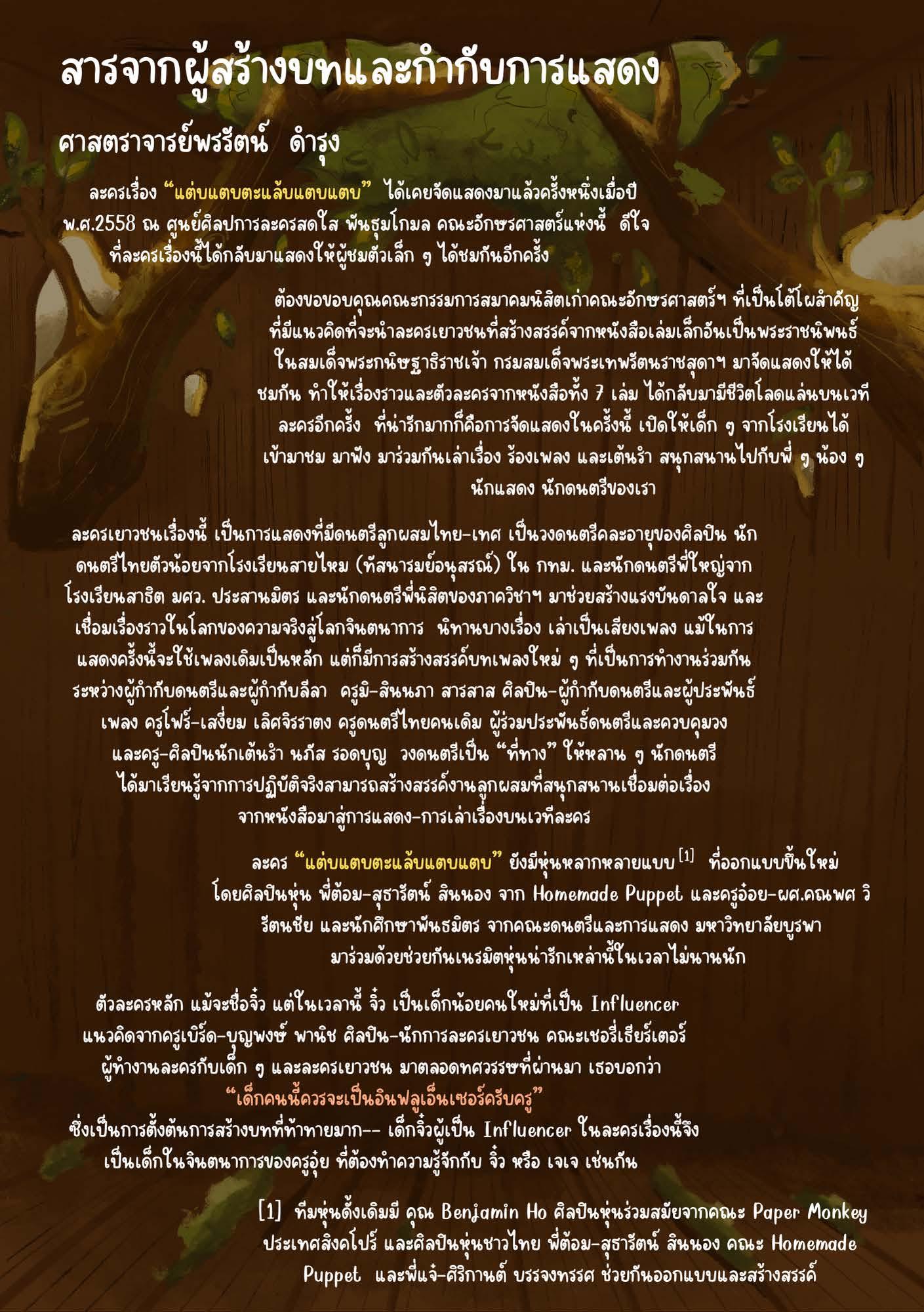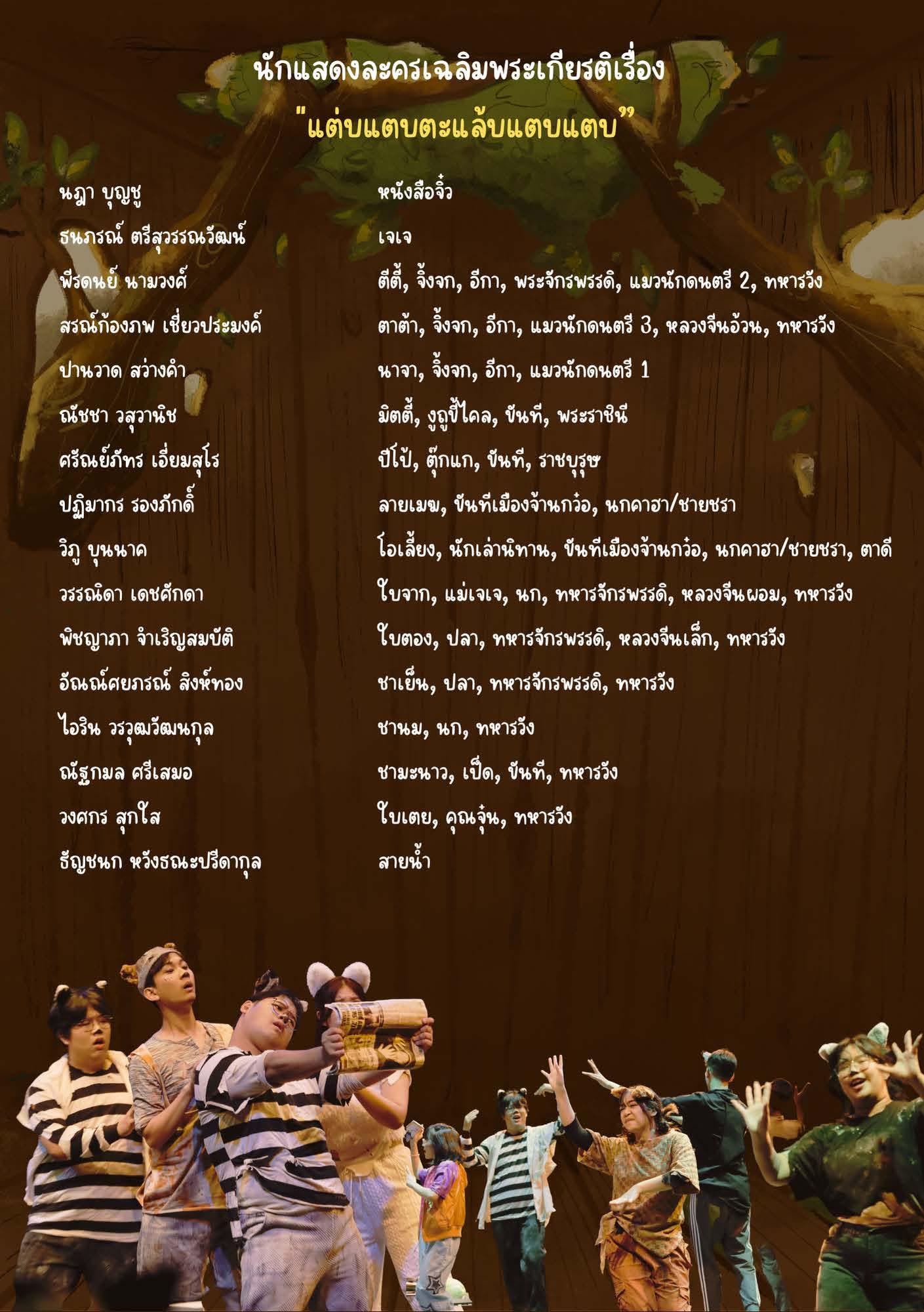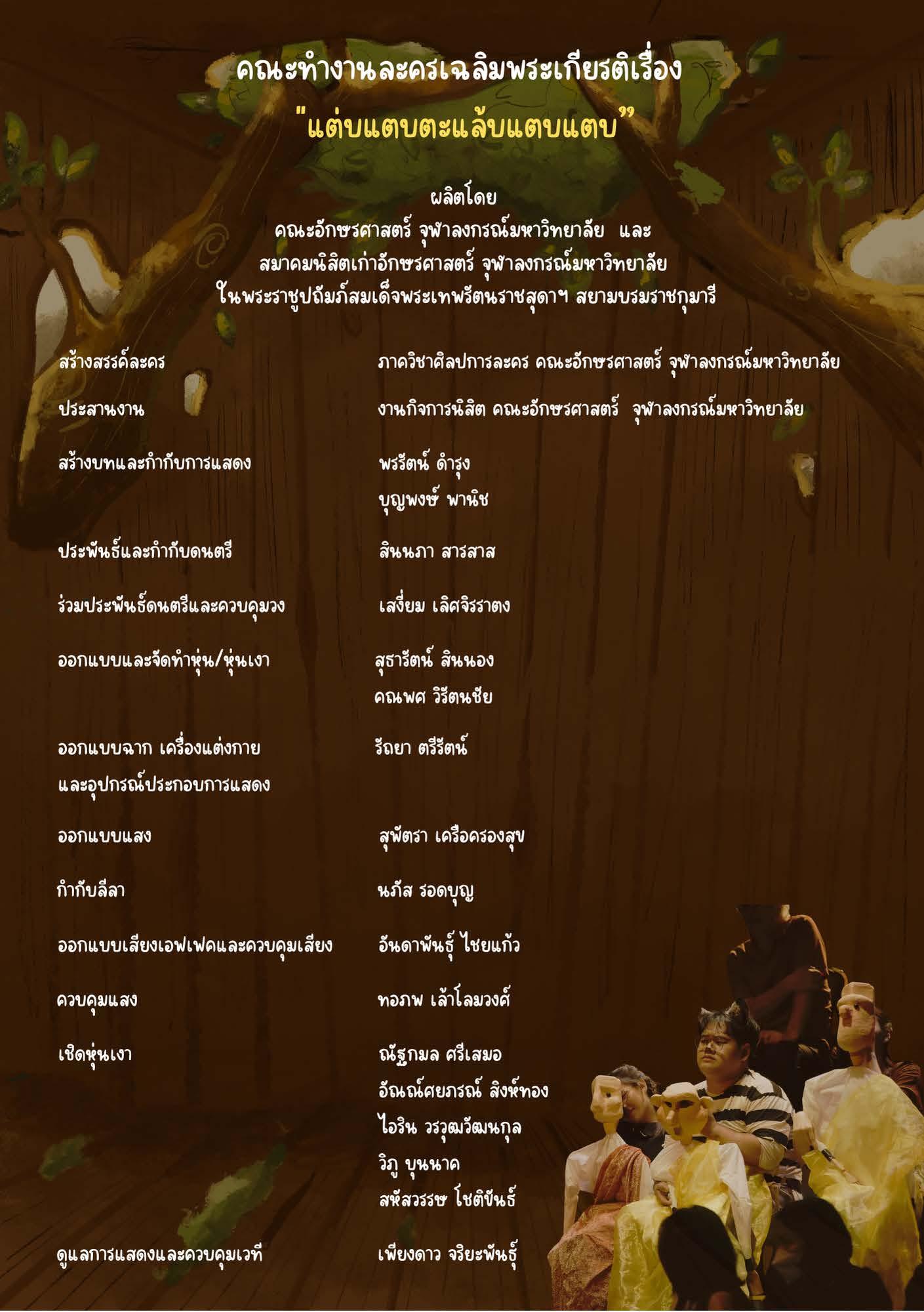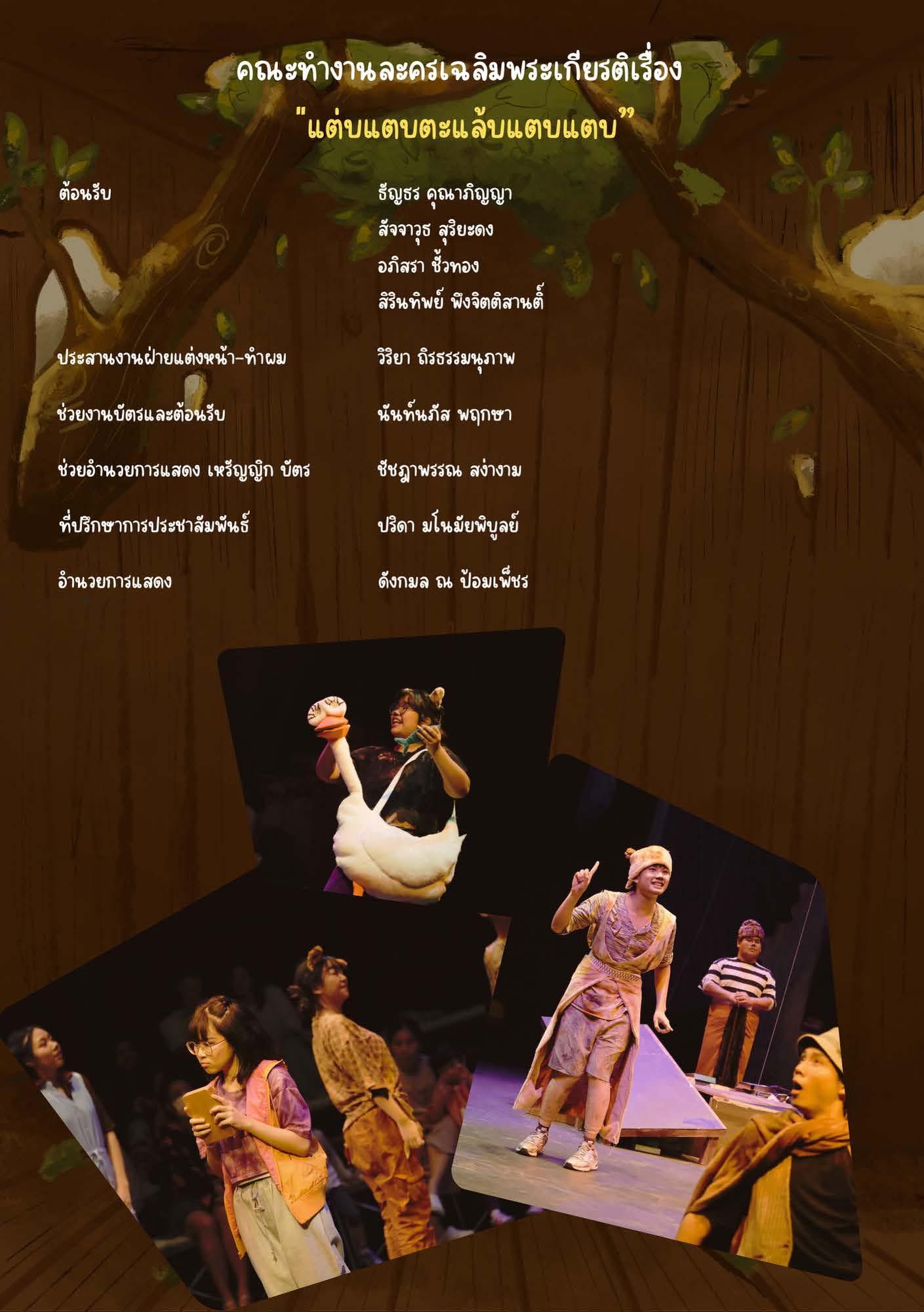 ในโอกาสที่สมเด็จพระกนิษฐาธิราชเจ้า กรมสมเด็จพระเทพรัตนราชสุดา ฯ สยามบรมราชกุมารี ทรงเจริญพระชนมายุ 69 พรรษาในวันที่ 2 เมษายน 2567 นี้ คณะอักษรศาสตร์ จุฬาลงกรณ์มหาวิทยาลัย ร่วมกับสมาคมนิสิตเก่าอักษรศาสตร์ จุฬาลงกรณ์มหาวิทยาลัย ในพระราชูปถัมภ์ฯ จะจัดการแสดงละครเวทีเฉลิมพระเกียรติเรื่อง “แต่บแตบตะแล้บแตบแตบ” จากพระราชนิพนธ์นิทาน ระหว่างวันที่ 5 - 8 มิถุนายน 2567 ณ ศูนย์ศิลปการละครสดใส พันธุมโกมล ชั้น 6 อาคารมหาจักรีสิรินธร คณะอักษรศาสตร์ จุฬาลงกรณ์-มหาวิทยาลัย โดยมีศาสตราจารย์พรรัตน์ ดำรุง เป็นผู้สร้างบทและกำกับการแสดง และอาจารย์สินนภา สารสาส เป็นผู้ประพันธ์และกำกับดนตรี