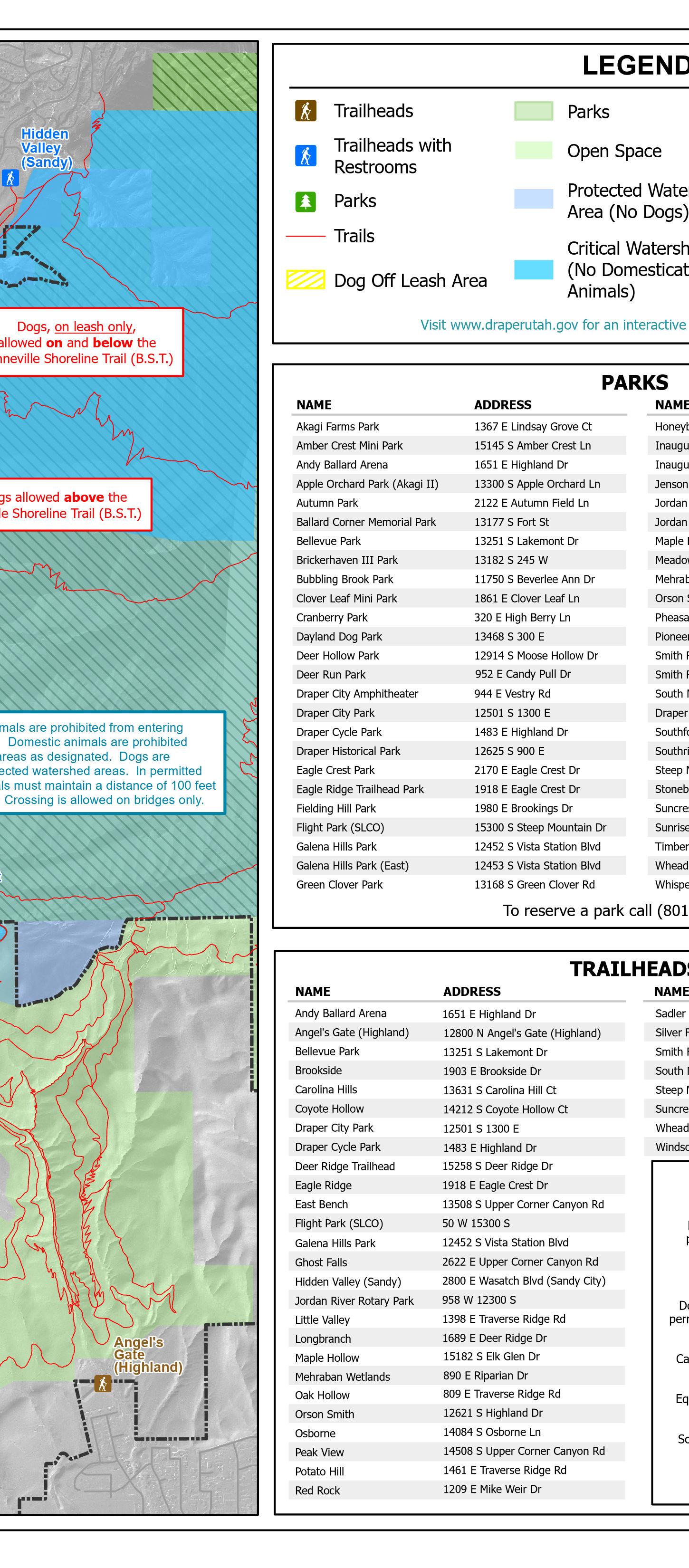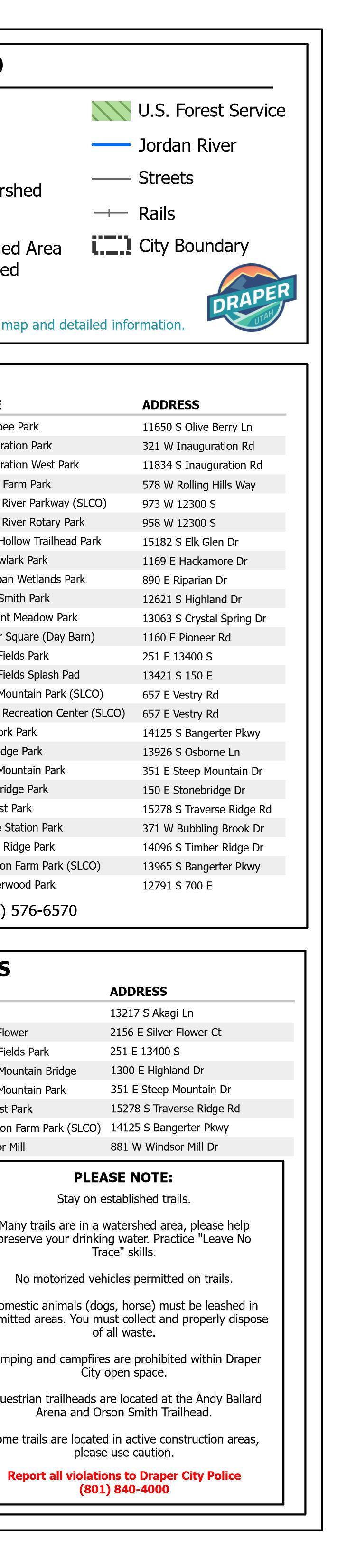 All adult program participants must be 16 years or older. Participants are encouraged to have their own insurance policy. Draper City is not liable for injury or “Acts of God”. All parking is “park at own risk”.
