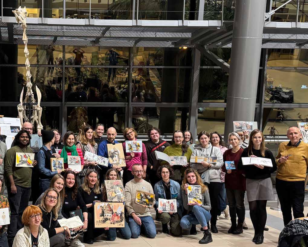 The event, with sketchers from throughout Poland, took place in the foyer of the Wybrzeże Theatre. This gave a stunning view of the most beautiful Christmas market in Europe (according to the Best Christmas Markets in Europe 2025 competition). We also sketched at the exhibition of the Faculty of Biology at the University of Gdańsk, which features a large hanging skeleton of a fin whale. Jula Majewska, Kasia J. Siuda, and Tetiana Ocheredko led workshops.