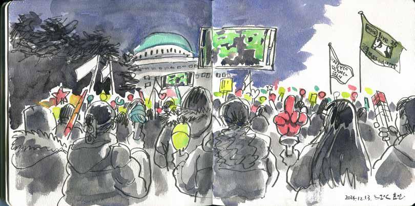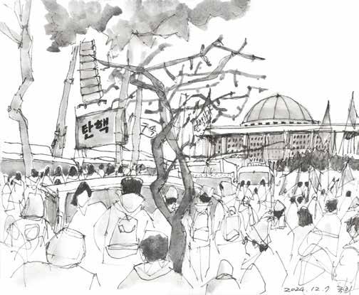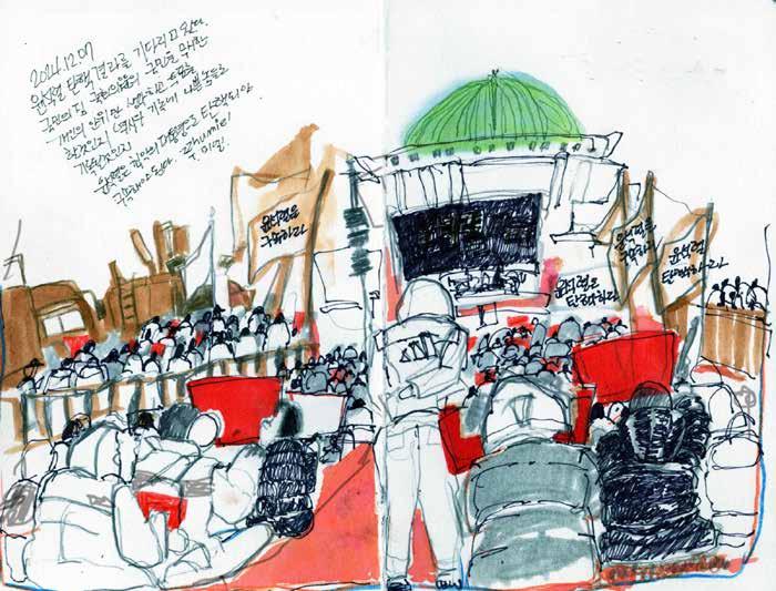 That night, thousands of Koreans rushed to the National Assembly and helped lawmakers make their way past military forces into the lawmaking chamber, where they halted the motion. Following the coup attempt, millions of Koreans protested for Yoon’s swift impeachment, with hundreds of thousands demonstrating outside the National Assembly. Urban sketchers were on the scene.