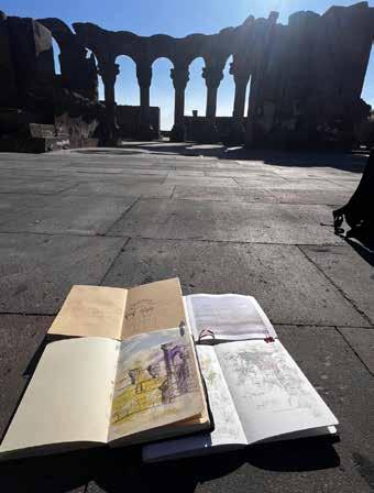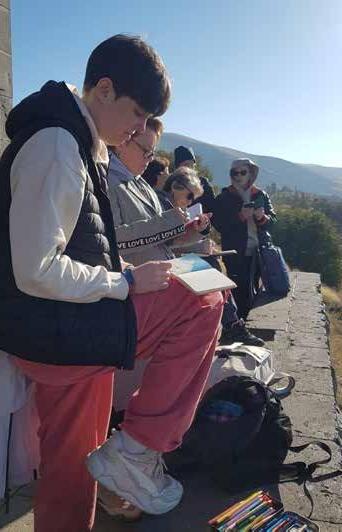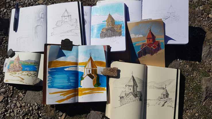 Our Budapestnutye group – made up of sketchers who live in different parts of the world and belonging to various USk chapters – gathered for a creative journey through Armenia. The visit featured sketching all around Yerevan’s vibrant streets, at Sevan Lake, the Monastery of Geghard, the Haghartsin Monastery complex, Dilijan, the Garni Temple, Zvartnots Cathedral, and the Arch of Charents, offering breathtaking views of Mount Ararat, Armenia’s iconic landmark. The people we met, on visits to the Martiros Sarian Home-Museum and the Sergei Parajanov museum, and the road trips through Armenia’s diverse landscapes, helped us to capture the richness of textures, colors, and warmth of the country in our sketches. We wholeheartedly recommend other urban sketches to follow our footsteps and visit Armenia to experience its beauty firsthand.