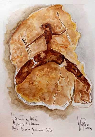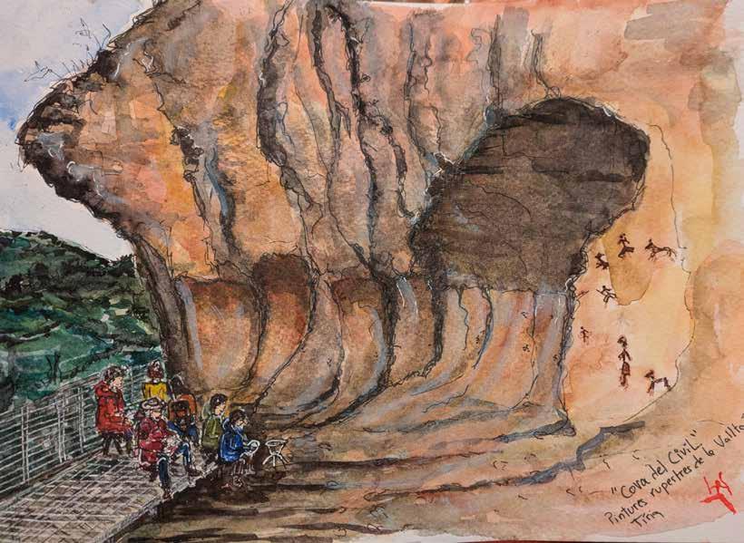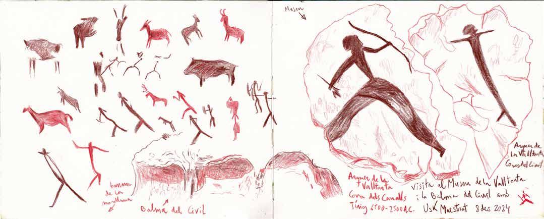 El diumenge 8 de desembre de 2024 alguns membres del grup Usk Maestrat vam gaudir del privilegi de poder dibuixar unes pintures rupestres de Tírig (a l’Alt Maestrat) fetes fa entre 4000 i 8000 anys. Vam visitar també el Museu de la Valltorta, qui gestiona les visites a diferents enclavaments prehistòrics de la zona. L’interior de la comarca del Maestrat té abundants i importants exemples d’art rupestre llevantí, un art rupestre molt narratiu que podem trobar en tot l’arc mediterrani espanyol. Ens va resultar molt interessant connectar en el temps, i a través del dibuix, amb dibuixants de fa milers d’anys. A partir del que véiem a les parets de la balma (petita cova) vam poder dibuixar caçadors, xiquets, xamans, cérvols, senglars, cavalls, bous, cabres… i tot això envoltats d’un paisatge encara molt similar al que veien ells llavors. Els dibuixos ens van transportar a un altre temps i van ajudar a connectar amb eixa gent. Realment, un viatge en el temps! Aquesta vegada vam visitar la Balma del Civil i l’interior del Museu, però més endavant tornarem per dibuixar altres coves i pintures rupestres de la zona.