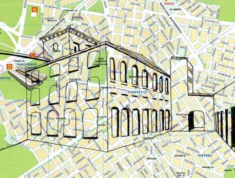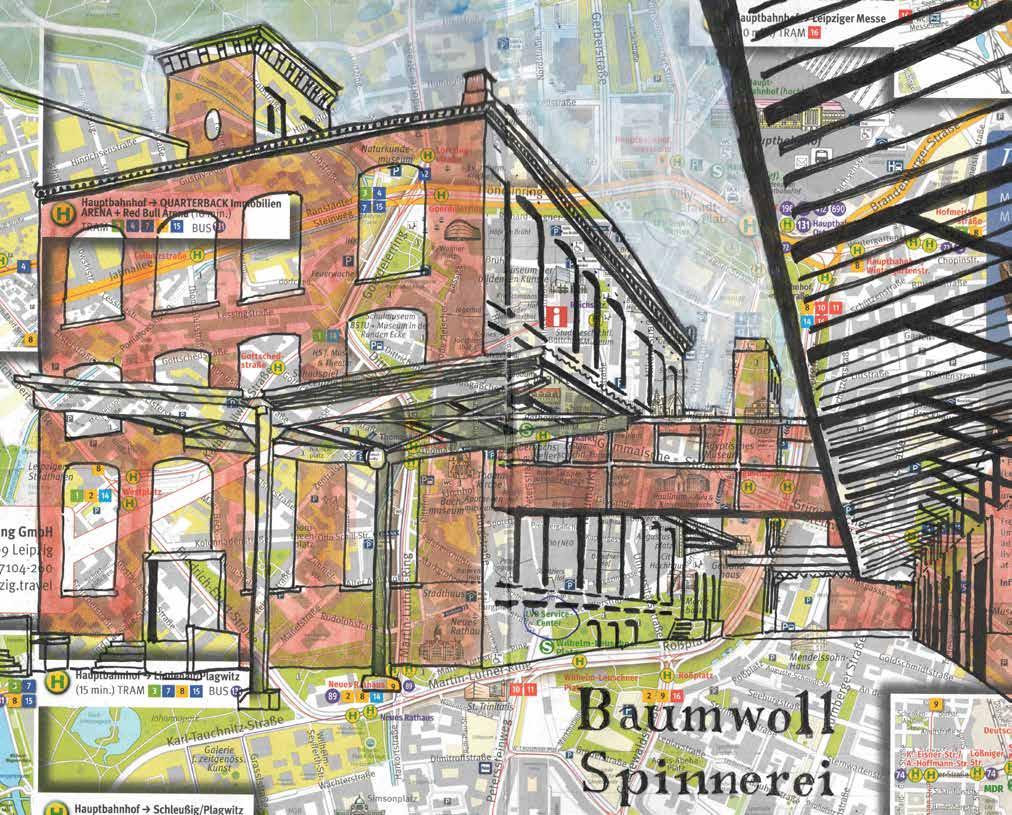 On a very hot August day we went to sketch at the Baumwollspinnerei complex in Leipzig. There are now galleries, a cinema and an artstore in the former cotton factory buildings. The intricate interlocking of these buildings made for an interesting perspective, and I just happened to have glued a map of Leipzig in my sketchbook to sketch on that day. Here’s the final result (opposite). I will show you the steps overleaf, using a map of Athens.
