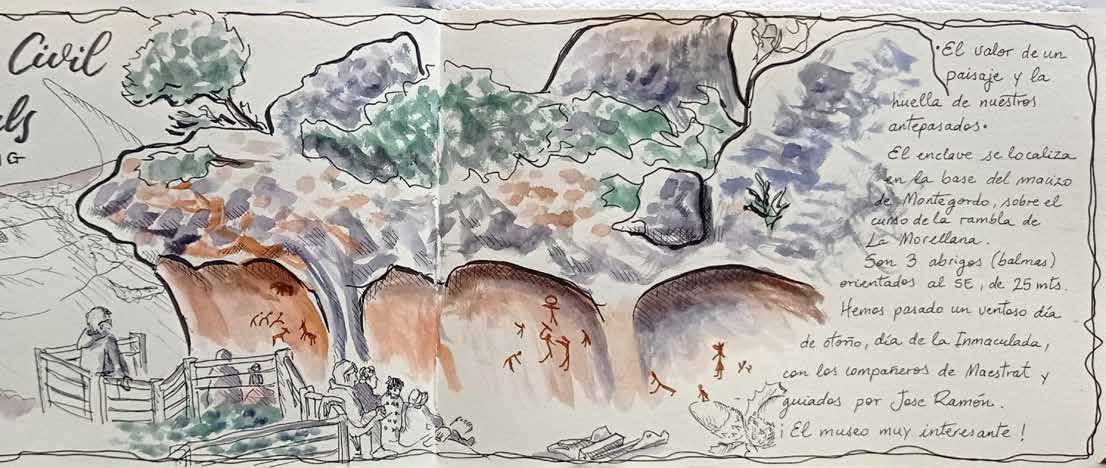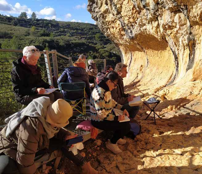 The group enjoyed the privilege of drawing cave paintings in Tírig (Alt Maestrat) which date to between 4000 and 8000 years old. The Maestrat region has manyimportant examples of Levantine rock art, a narrative form of rock art that can be found throughout the Spanish Mediterranean. Drawing the cave sketches of thousands of years ago we saw hunters, children, shamans, deers, wild boars, horses, oxen and goats – all in a landscape still very similar to what the ancient people would have experienced. The drawings transported us to another time and helped us to connect with them. We also visited Balma del Civil and its Museum. We plan to return to draw other caves and cave paintings in the area next year.