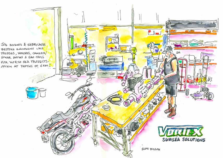 I’ve learned there are so many interesting and inventive people doing surprising things on our doorstep. It has greatly improved my people drawing skills. Businesses I’ve drawn include: inventors and fabricators of North Sea Oil subsea devices, the ‘sshhmute’ (used for silencing brass instruments), and track grips for permafrost caterpillars; butchers; bakers; a gin distillery; an underwater remote-operated vehicle; tattoo studio; goldsmiths and jewellers; dairy farms and farriers.