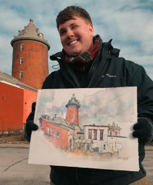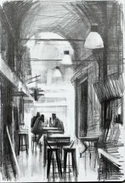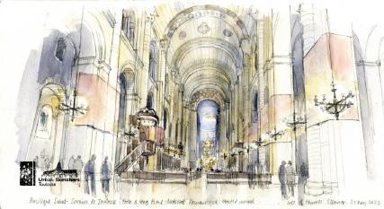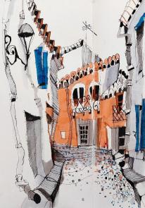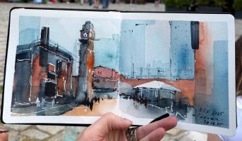 Finally, we’ll consider what part of the building we are most interested in (our story), and this will help us decide on how to start our main sketch. This demo will incorporate lots of interaction from the group. Together we’ll decide on story, materials and colours and we’ll work spontaneously allowing the sketch to evolve as we work.