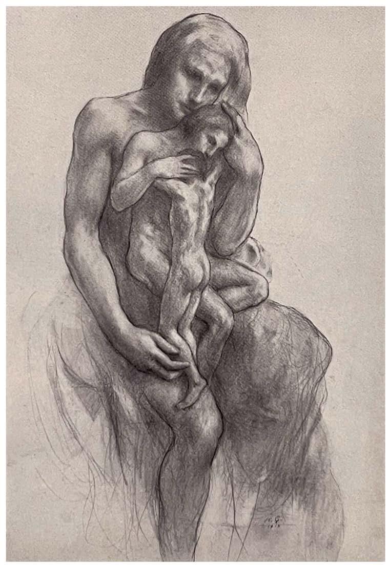 Towards the Infinite, a haunting watercolor and graphite drawing completed the same year, captures with moving pathos the artist’s anxiety around survival, and, indeed, his impulse to mythologize precarity [PLS. 58, 64]. An image produced on relatively sturdy Agawam bond typing paper, it renders its portrait of a tilted head into a membrane between presence and loss. Although the drawing was exhibited at Knoedler Gallery with the nondescript title Study of a Head, Gibran later told friends it depicted his mother Kamila at the moment of her expiration, “in the last instant of her earthly life and in the first instant of her life beyond her.”29 Aspects of his wash technique in the image, with his flat downward strokes of heavy pigment suspension, call to mind the commemorative aspect of photographs, complete with maudlin colorization to make vivid the memory of lost family. Pink fleshy tones accumulate on the drawing’s surface in visual separation from the outline of facial features. Yet as Gibran also makes clear in his Arabic-language commentary, his theme was not the person of his mother in her individuality. Rather, he aimed to trace a belief in progeny that placed his immediate mother (ummī ) in a network of “mothers and sisters in spirit” (ummahātī wa-akhawātī bi-al-rūḥ). In this regard, every face served as a mother and every body brought together the materials of past and future survival.