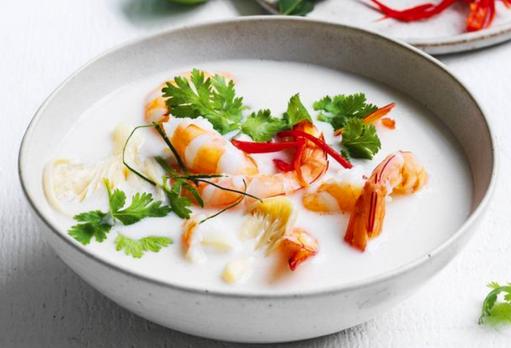 1 In a large soup pot, combine the broth, coconut milk, soy sauce, fish sauce, honey, peanut butter, and curry paste. Add the Shrimp, cremini mushrooms, red peppers, ginger, and garlic Set over medium heat on the stove and bring to a simmer, reduce the heat to medium-low and simmer for 15 minutes or until the shrimp are cooked through.