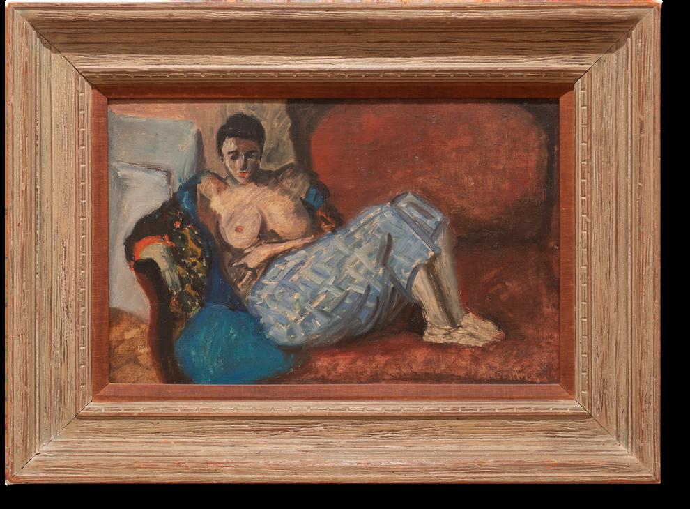 The Japanese Kimono, depicting a reclining nude in an opened Japanese Kimono, is an unusual and fine example of an early Milton Avery portrait