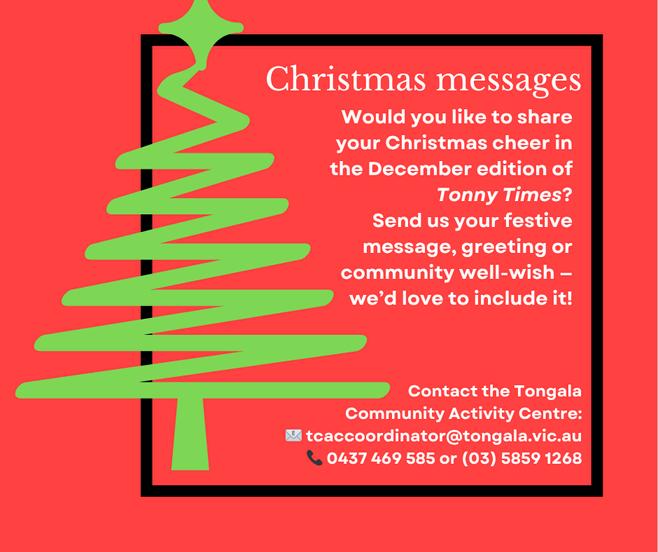 sometime.Thankyouto theTongalaOpportunity Shopandlocalindividuals fortheirdonations,which assistedwiththecostsof theafternoonteaprovided byTongalaBakeryand TonnyTakeaway. Thecelebrationswere organisedbytheFriendsof TongalaAgedCarewith thesupportofRespect