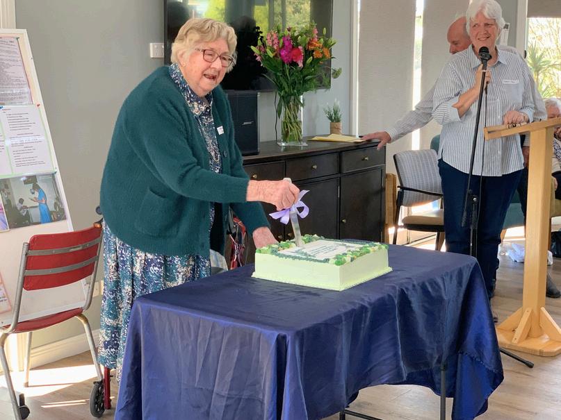 Thecelebratorycakewas cutbywell-knownlocal MrsMoiraPankhurst formerhospitalmatron, Committeeof Managementmember,