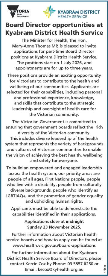 Includes:Deliciouslunchandgreat entertainment;bushverse,yarns,and poetryfeaturingmembersof KyabramBushVerseGroupandvisiting performers Don’tmissthisgreat opportunitytolistento,andlaugh alongwith,thesetalentedfolk. Plus,therewillbearaffle. BookingsbeingtakenNow! Pleasecalltosecureyourseat/table. Greg-0418599924 Mick-0427522097 Paula-(03)58522281 Welookforwardtoseeingyouthere. ALLWELCOME
