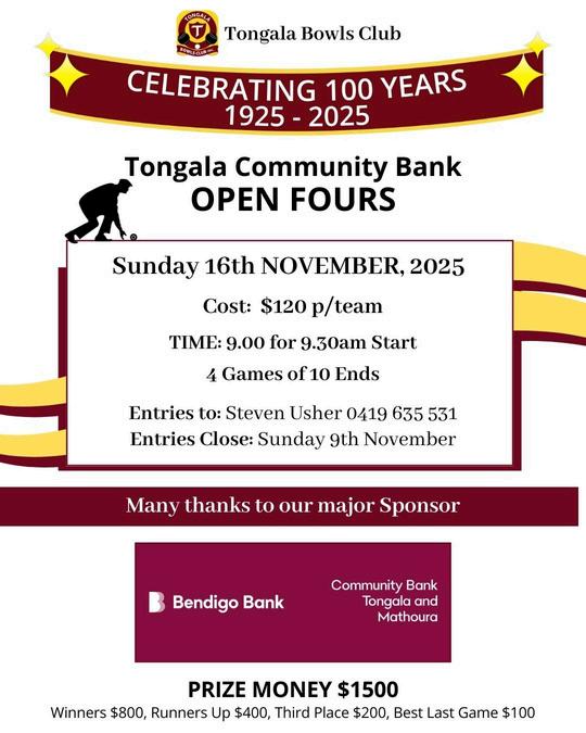 Whilethefocusison pennantcompetition, TongalaBowlingClub’srole indevelopingthenext generationofbowlerswas theheadlineactofthe openingmonthofthis season WiththesupportofPeter Tinning,wifeBernieand legendGeoffTinning(who actedasmentorsand coasches)theTongala PrimarySchool’slawnbowls teamfinishedrunners-upat thestateprimaryschools lawnbowlschampionships. Itwasthethirdyearinarow thattheclubhadmadeitto thefinalsandtheylosta closefinaltoCowes6-8 Inothersignificantnewsa datehasbeensetforthe inauguralJBChallenge, celebratingthecontribution ofthelateJohnBentley(or JB)totheTongalaand Mathouracommunities throughhispassionfor communitybanking