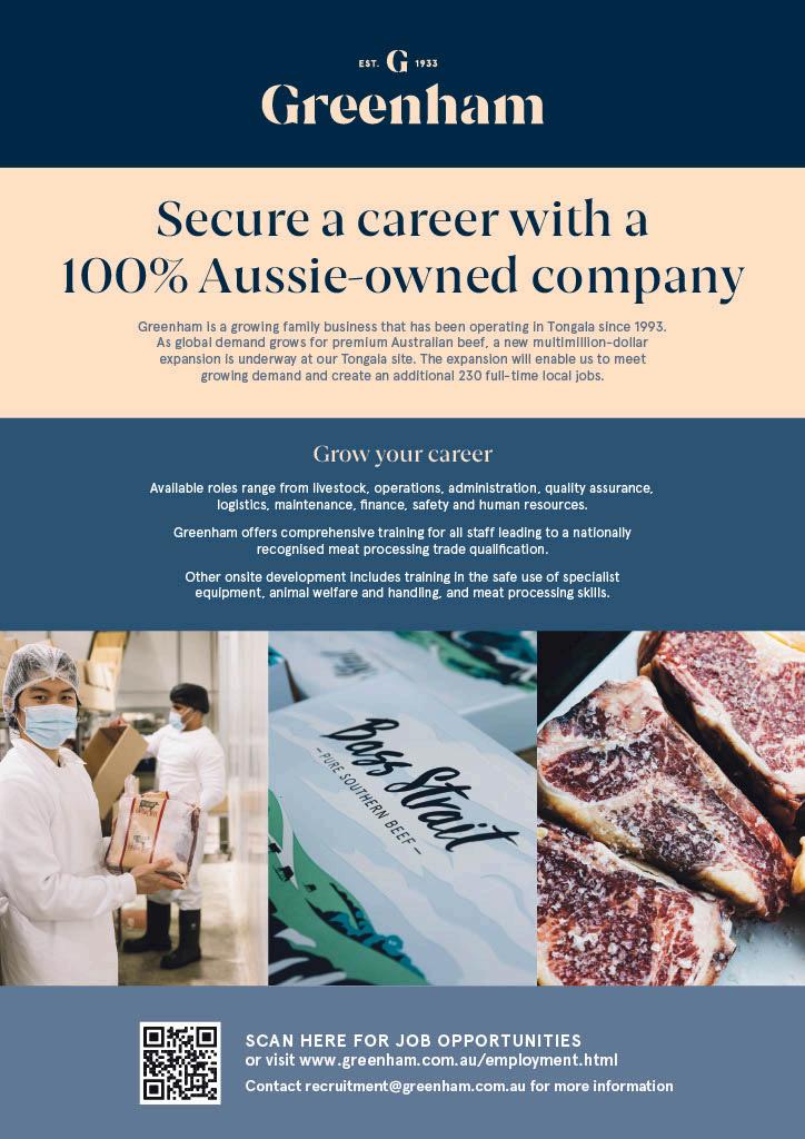 celebratedatGreenham Australia,withthefully operationalTongala abattoirfollowinga significantexpansionthat doubledproduction, createdhundredsoflocal jobs,andsecurednational andinternationalcontracts Thestate-of-the-artfacility nowprocessesmorethan 1,300cattleperday, reinforcingTongala’s