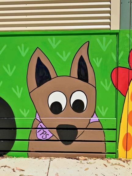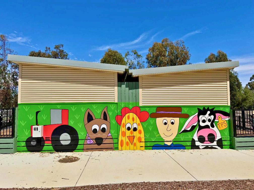 ofthecommunitytolife withcheerfulcharacters includingatractor,a farmer,apup,achicken andevenahappycow Thefinishedartworkisa brightcelebrationof Tongala’sruralheartanda welcomenewfeatureat theschool