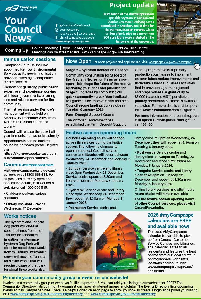 Julybroughtearlyfestive cheerwithaChristmasin Julycelebrationsupported byCampaspeShire,while sportingclubsreached mid-seasonformand schoolscontinuedcreative projects. Communityorganisations alsomaintainedstrong supportformigrantworkers andvulnerableresidents Communitywellbeingwas highlightedwithafree Men’sHealthWeek breakfastattheTongala TownHall,hostedbythe TongalaCommunityActivity Centre,andtheopeningof anewRVOvernightStopon
