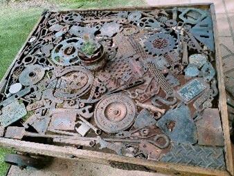 Atfivehereceivedaplastic golfset,orangeshafts,blue heads,andateightwas handedthreehickoryshaftedironswithrusted heads.