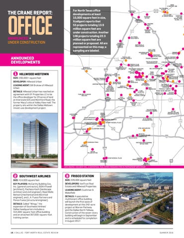 SIZE: 200,000+ square feet DEVELOPER: Hillwood Urban LEASING AGENT: Bill Brokaw of Hillwood Urban DETAILS: Hillwood Urban has reached an agreement with EF Properties LC to be the office developer for 20 acres of land at Interstate 635 and Montford Road, the former Macy’s site at Valley View mall. The property sits within the Dallas Midtown mixed-use development project.