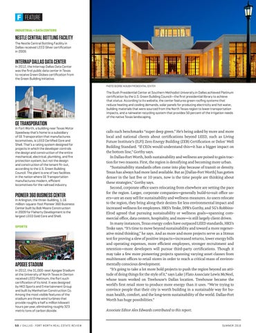 calls such benchmarks “super deep green.” He’s being asked by more and more local and national clients about certifications beyond LEED, such as Living Future Institute’s (ILFI) Zero Energy Building (ZEB) Certification or Delos’ Well Building Standard. “If CEOs would understand this—it has a bigger impact on the bottom line,” Gorthy says. In Dallas-Fort Worth, both sustainability and wellness are poised to gain traction for two reasons. First, the region is densifying and becoming more urban. “Sustainability standards often come into play because of transit or density. Texas has always had more land available. But as [Dallas-Fort Worth] has gotten denser in the last five or 10 years, now is the time people are thinking about these strategies,” Gorthy says. Second, corporate office users relocating from elsewhere are setting the pace for the region. Larger, corporate companies—generally build-to-suit office users—are an easy sell for sustainability and wellness measures. As users relocate to the region, they bring along their desires for less environmental impact and increased wellness for employees. HKS’s Teske, DPR’s Gorthy, and 5G’s RobbinsElrod agreed that pursuing sustainability or wellness goals—spanning commercial office, data centers, hospitality, and more—is still largely client driven. In many instances, Texas energy codes have outpaced LEED standards, HKS’s Teske says. “It’s time to move beyond sustainability and toward a more regenerative mind thinking,” he says. And as more and more projects serve as a litmus test for proving a slew of positive impacts—increased returns, lower energy bills and operating expenses, more efficient employees, stronger recruitment and retention—more developers will pursue third-party certifications. Though it may take a few more pioneering projects spanning varying asset classes from multitenant offices to retail stores in order to reach a critical mass of environmentally conscious development. “It’s going to take a lot more bold projects to push the region beyond an attitude of doing things for the style of it,” says Lake | Flato Associate Lewis McNeel, whose team worked on Treehouse’s Dallas location. Treehouse became the world’s first retail store to produce more energy than it uses. “We’re trying to convince people that their city is worth building in a sustainable way for human health, comfort, and the long-term sustainability of the world. Dallas-Fort Worth has huge possibilities.” Associate Editor Alex Edwards contributed to this report.