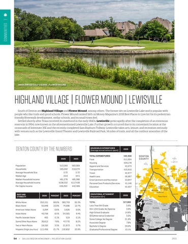 HIGHLAND VILLAGE | FLOWER MOUND | LEWISVILLE Gainesville South of Denton are Highland Village and Flower Mound, among others. The former sits on Lewisville Lake and is popular with people who like trails and good schools. Flower Mound ranked 16th on Money Magazine’s 2018 Best Places to Live list for its pedestrianfriendly Riverwalk development, stellar schools, and its small-town feel. Settled shortly after Texas received its statehood in the early 1840s, Lewisville grew rapidly after the completion of an enormous reservoir in 1954, now known as the aforementioned Lewisville Lake. Further growth occurred due to its convenient location at the crossroads of Interstate 35E and the recently completed Sam Rayburn Tollway. Lewisville takes arts, leisure, and recreation seriously with venues such as the Lewisville Grand Theater and Lewisville Railroad Park, 14 miles of trails, and all the outdoor amenities of the lake.