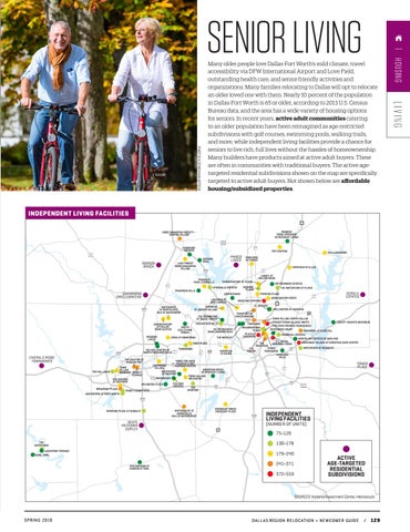 Many older people love Dallas-Fort Worth’s mild climate, travel accessibility via DFW International Airport and Love Field, outstanding health care, and senior-friendly activities and organizations. Many families relocating to Dallas will opt to relocate an older loved one with them. Nearly 10 percent of the population in Dallas-Fort Worth is 65 or older, according to 2013 U.S. Census Bureau data, and the area has a wide variety of housing options for seniors. In recent years, active adult communities catering to an older population have been reimagined as age-restricted subdivisions with golf courses, swimming pools, walking trails, and more, while independent living facilities provide a chance for seniors to live rich, full lives without the hassles of homeownership. Many builders have products aimed at active adult buyers. These are often in communities with traditional buyers. The active agetargeted residential subdivisions shown on the map are specifically targeted to active adult buyers. Not shown below are affordable housing/subsidized properties.