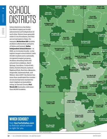 School districts in the DallasFort Worth region are locally administered and independent of each other. District lines generally relate to city boundaries, but they are not exclusive to them. For example, Richardson ISD includes students in Richardson and parts of Dallas and Garland. Dallas Independent School District—or DISD, as it is known locally—is the region’s largest school district, with 153,861 students and a nationally recognized magnet program. Students attending DallasGarner ISD ISD 201 | schools live in Addison, Balch Springs, Carrollton, Cockrell Hill, Dallas, Farmers Branch, Garland, Millsap ISD Highland Park, Hutchins, Mesquite, 980 | 1057 Seagoville, University Park, and Wilmer. Since 2007, the district has more than quadrupled the number of schools that have reached the state’s highest accountability rating. In Tarrant County, Fort Worth ISD dominates, with more than 84,000 students.