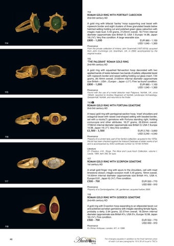 ROMAN GOLD RING WITH FORTUNA GEMSTONE 2nd-3rd century AD A heavy gold ring with pentagonal-section hoop, ‘inset’ shoulders and octagonal bezel with raised oval-shaped setting with beaded border, set with a nicolo(?) gemstone with Fortuna standing right, holding cornucopia and other attributes. 18.27 grams, 26.83mm overall, 17.56mm internal diameter (approximate size British O, USA 7, Europe 14.98, Japan 14) (1"). Very fine condition. £2,500 - 3,500 EUR 2,750 - 3,850 USD 3,240 - 4,540 Provenance Property of a London lady, part of her family’s collection; acquired in the 1970s; this lot has been checked against the Interpol Database of stolen works of art and is accompanied by AIAD certificate number no.10140-167654.