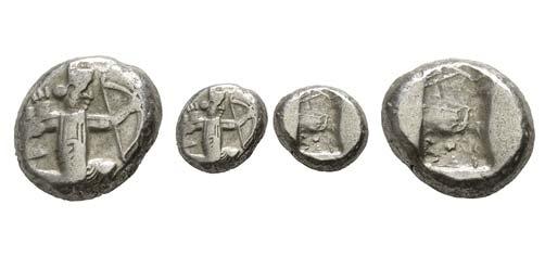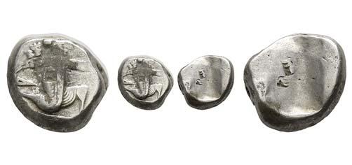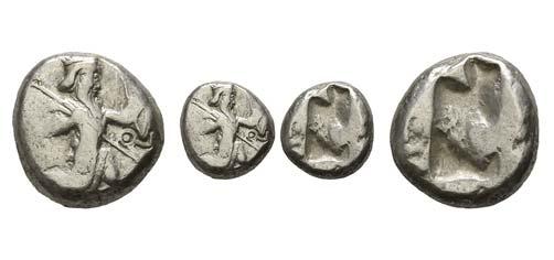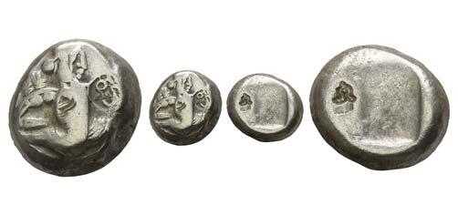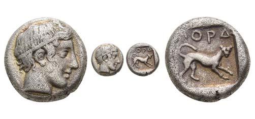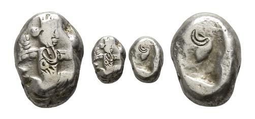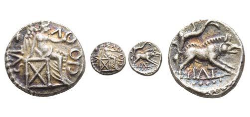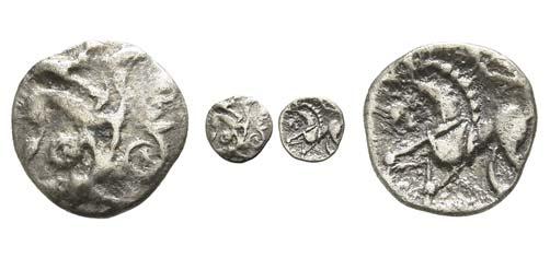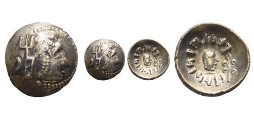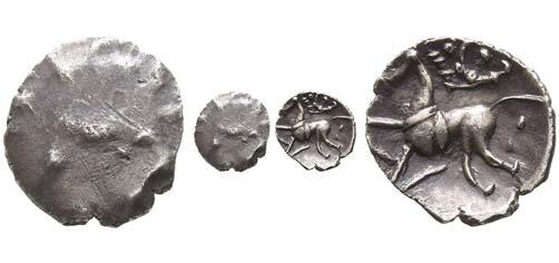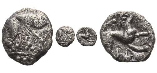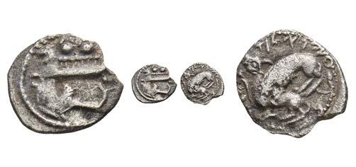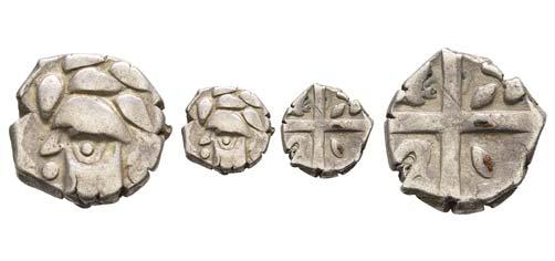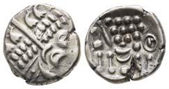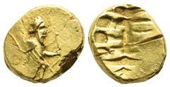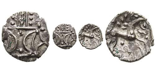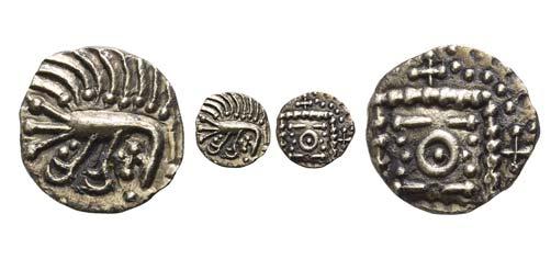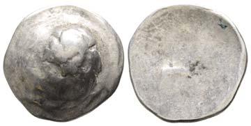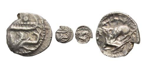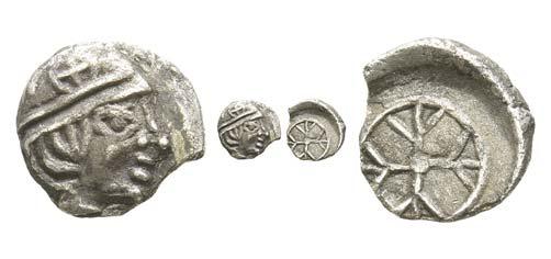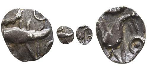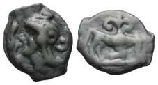 Linear head to left, three dots in centre / Stylised bull to left. ABC 162; VA 122; BMC-; SCBC 63. 1.19gr, 16mm, 4h. Good Very Fine. Broken. Excessively rare; no other examples on CoinArchives.
