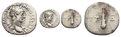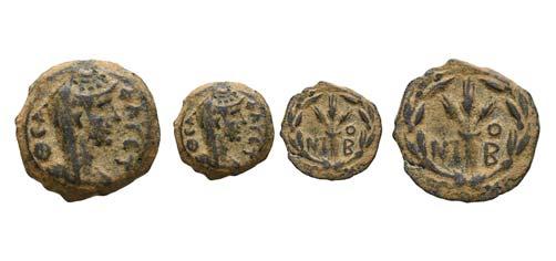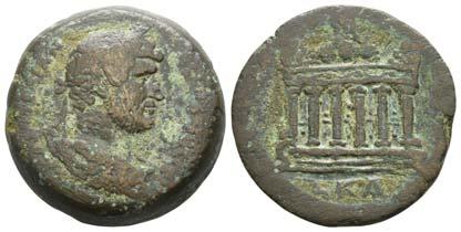 Figure standing facing and holding curved lituus and grapes, COM to left field, MI F to right / Laureate bust of Tiberius to right, VERI behind head, CA before. VA 533-1; ABC 1250; SCBC 136. 1.20gr, 12mm, 1h. Very Fine. £40 - 60