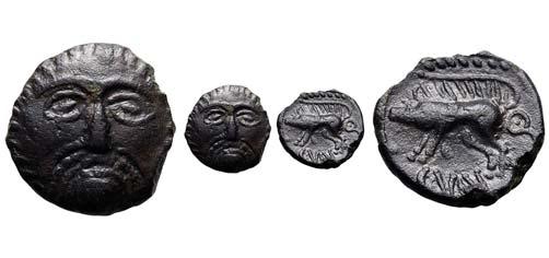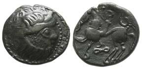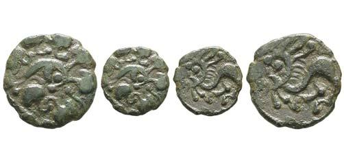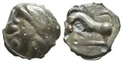 One of the rarest of Kentish potins. This specimen is desirable because it displays a neat casting tang and because striations are clearly visible on the obverse, caused by a piece of wood used to smooth off the unbaked clay casting mould before the lines of the head were scribed.