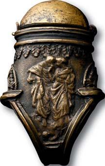 Comprising in high relief the Osirian triad (Nephthys, Horus, Isis) standing side by side on an integral plinth against a dorsal pillar; Nephthys (right) and Isis (left) shown frontally wearing headdresses with their own attributes, each holding the hands of Horus in the centre, naked and wearing the side-lock of youth; ribbed loop at the top for suspension.